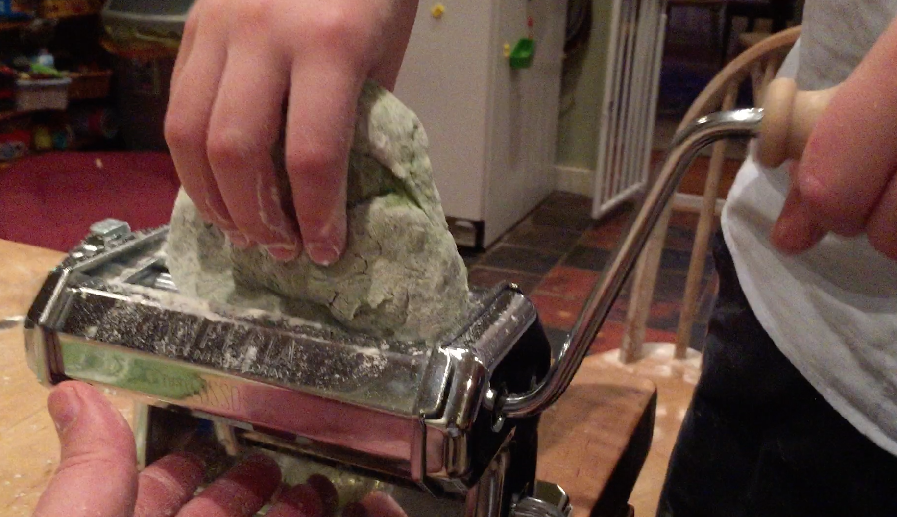 Maxime putting the pasta through the machine, w Papa catching
