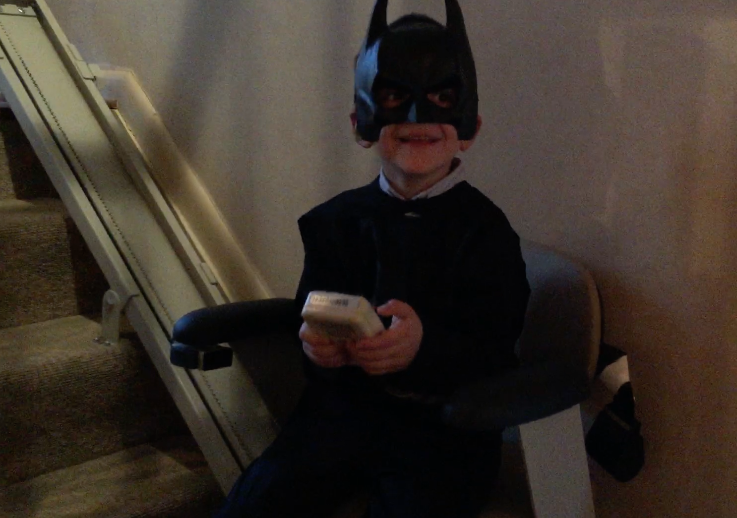 Well, if he could not sleep in it, he sure was going to wear it. We attempted to reason with him that Halloween was still five days away. But we were met with the blank stare that greets all news having nothing to do with his set plans.