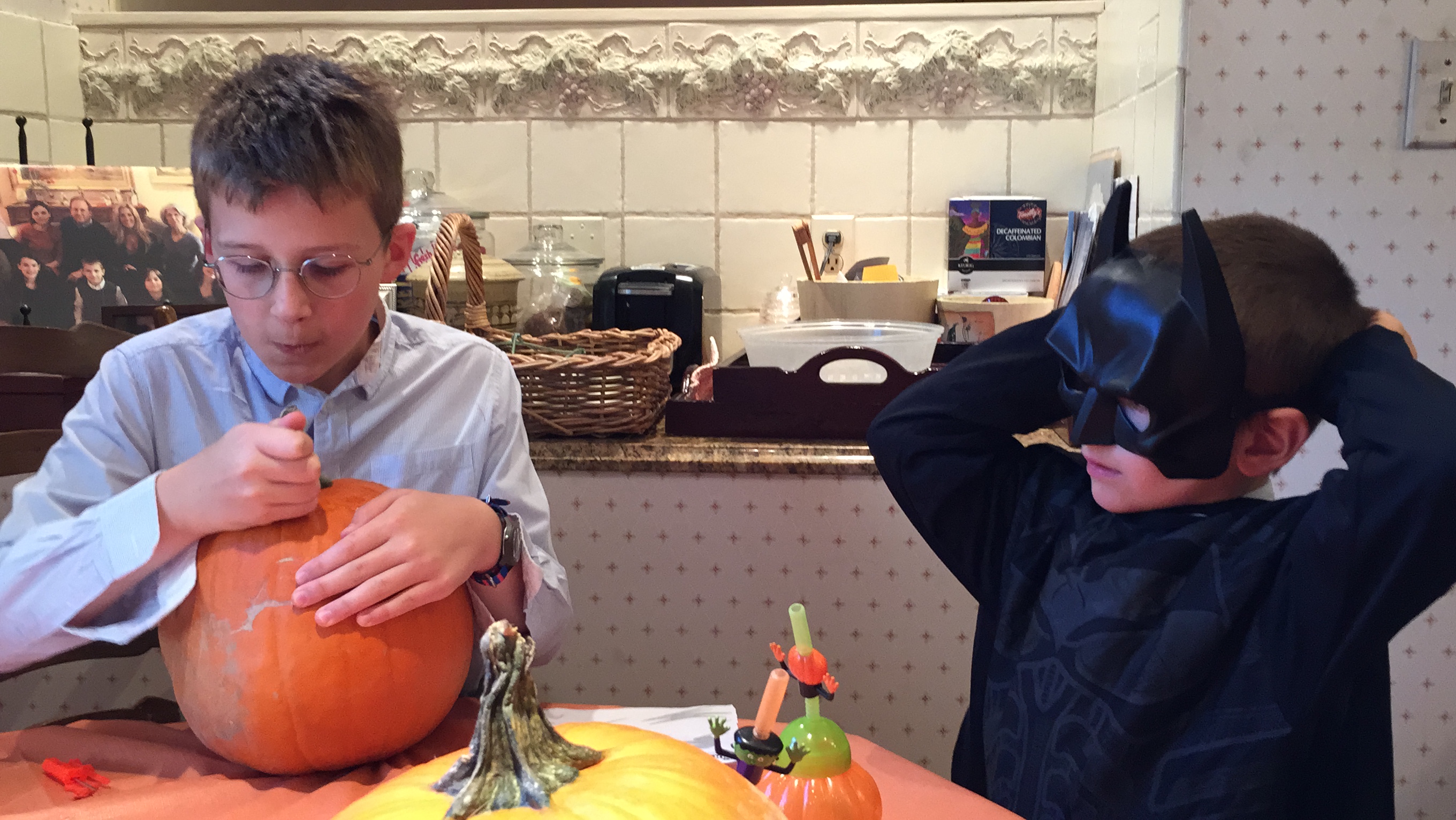 While cutting Halloween pumpkins with his brother