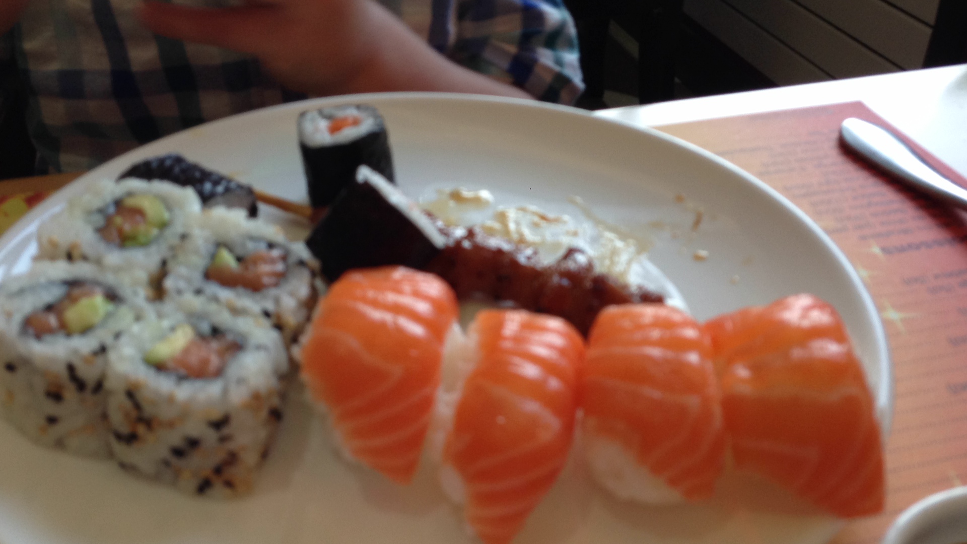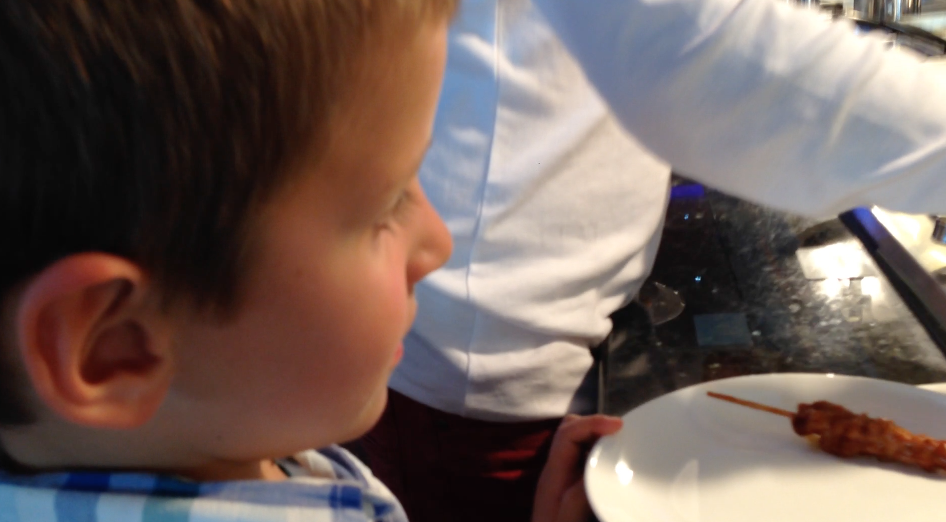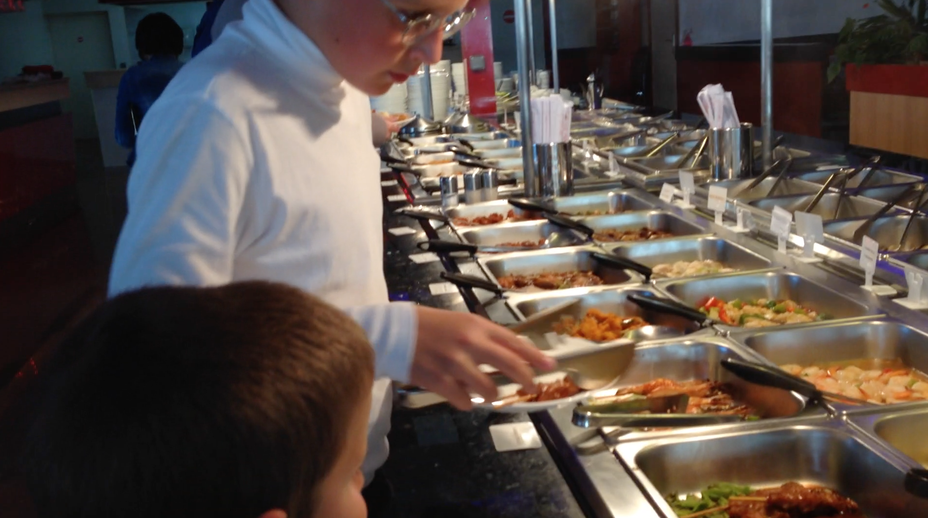 Maxime helps his brother at the buffet. They both like the kebabs. Gabriel then has pretty much always and strictly sushi: