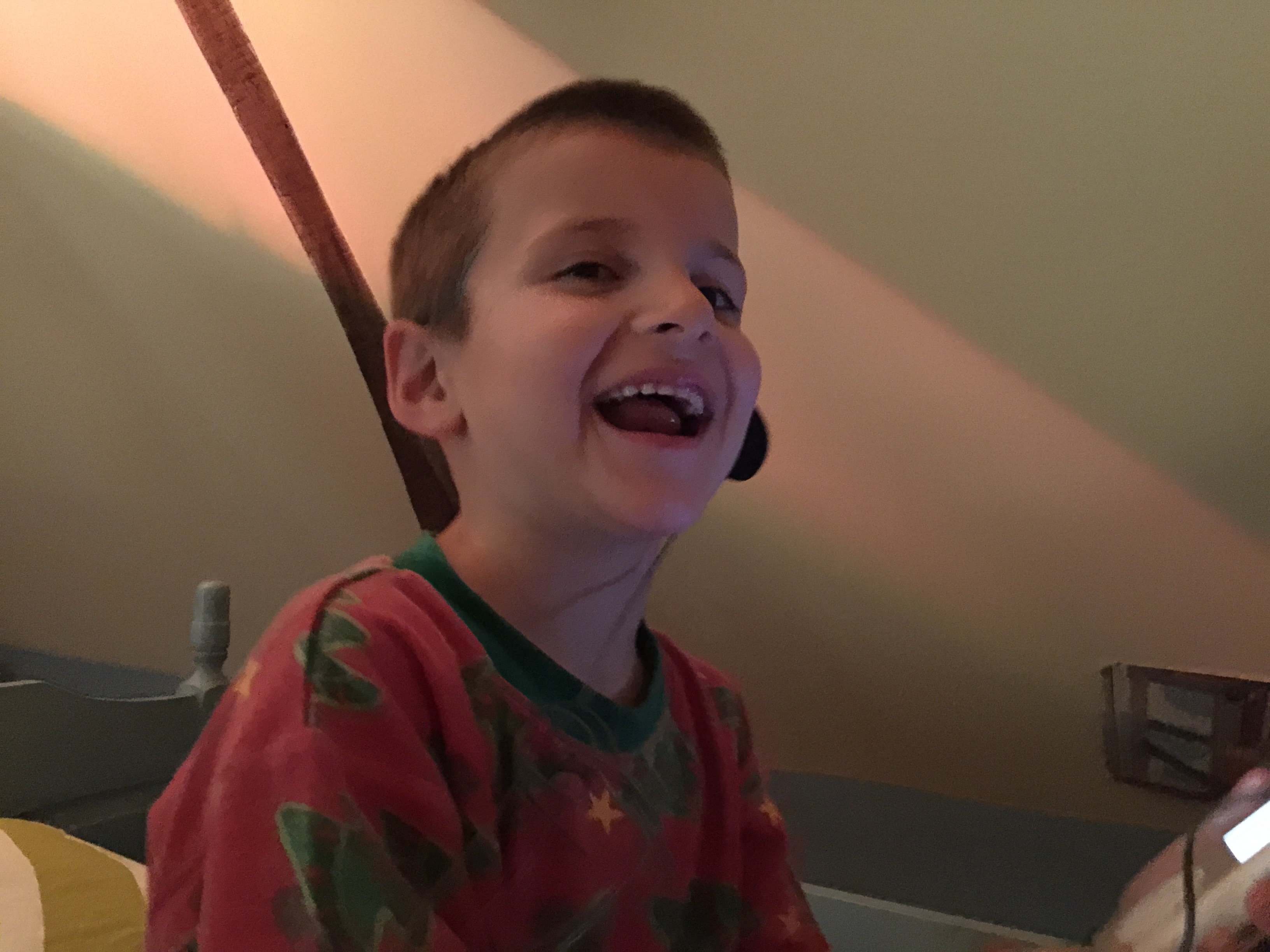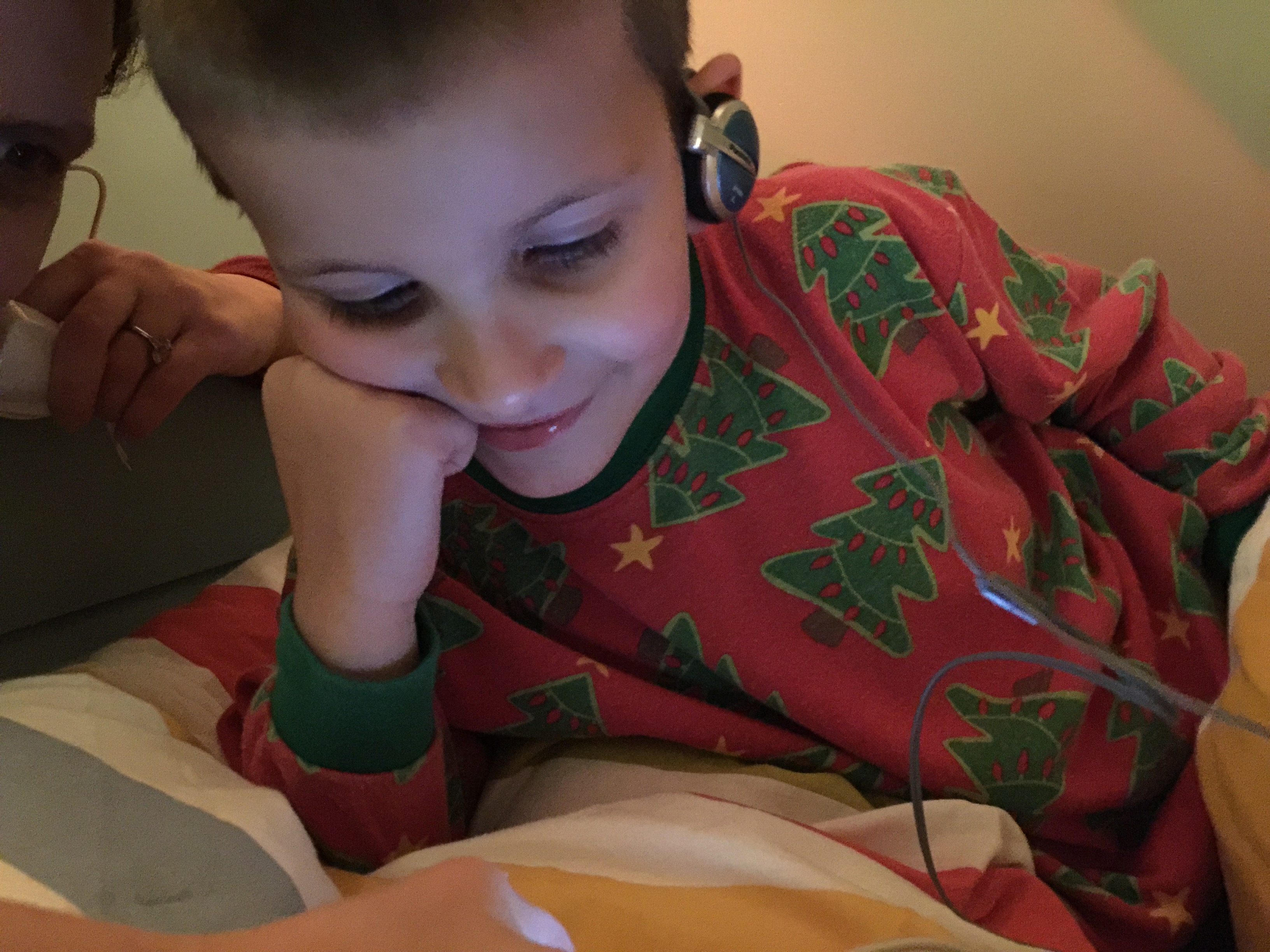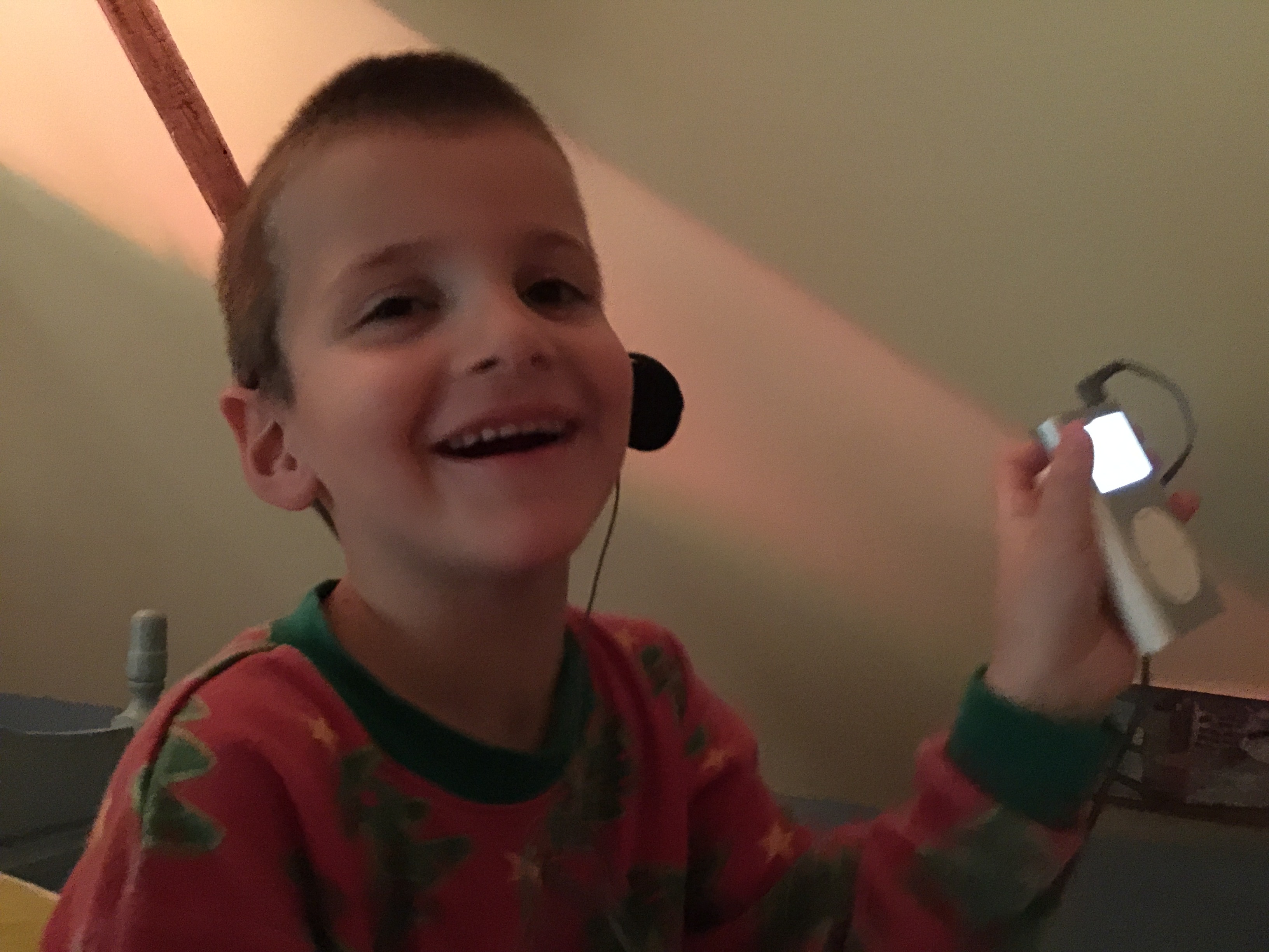 Here, he was delighted to have a music player of his own, with headphones, just like his older brother. We were laughing like crazy, as Gabriel seeks out — and plays — Aerosmith, which is a hard rock band. He was beside himself with happiness. And his eyes twinkled all the while.