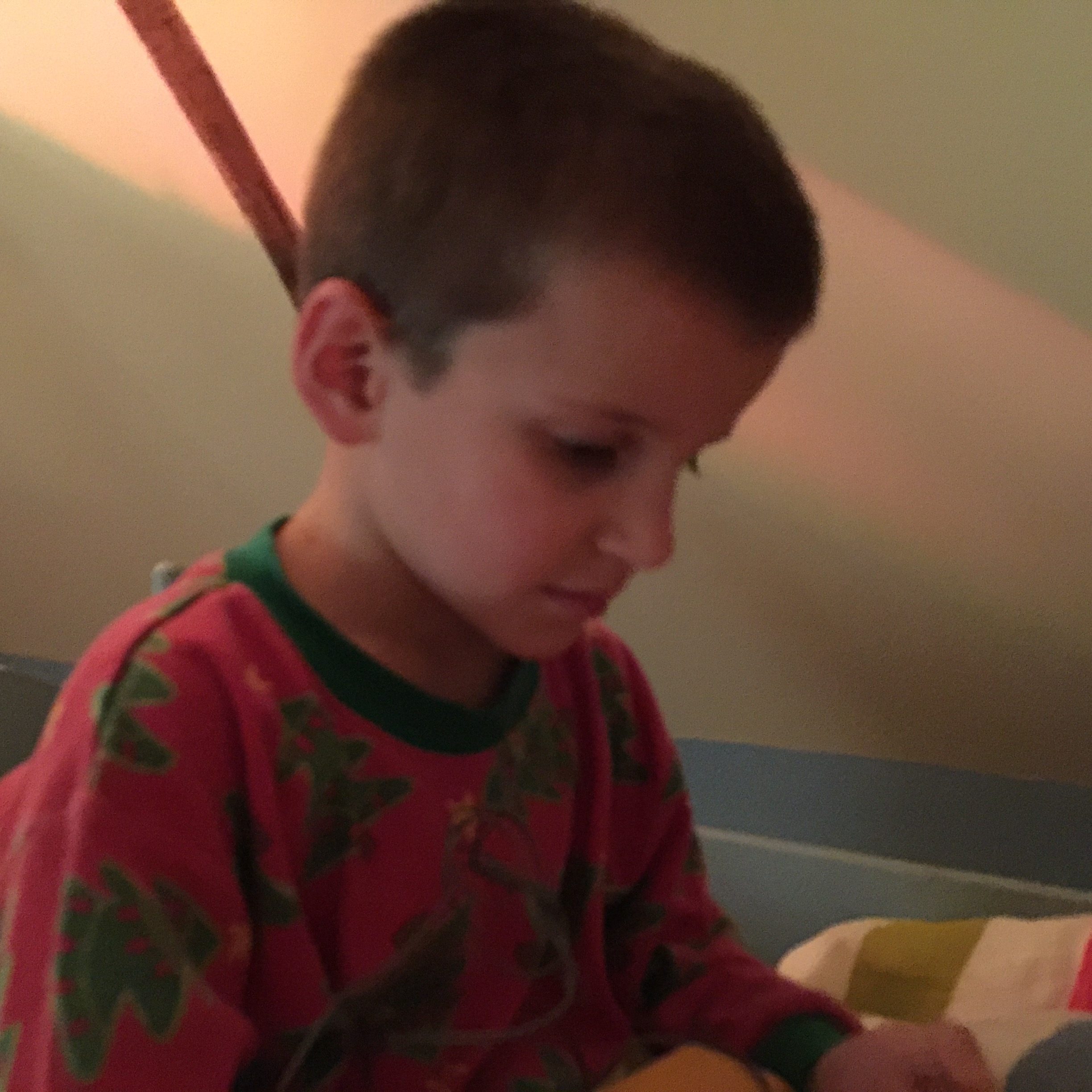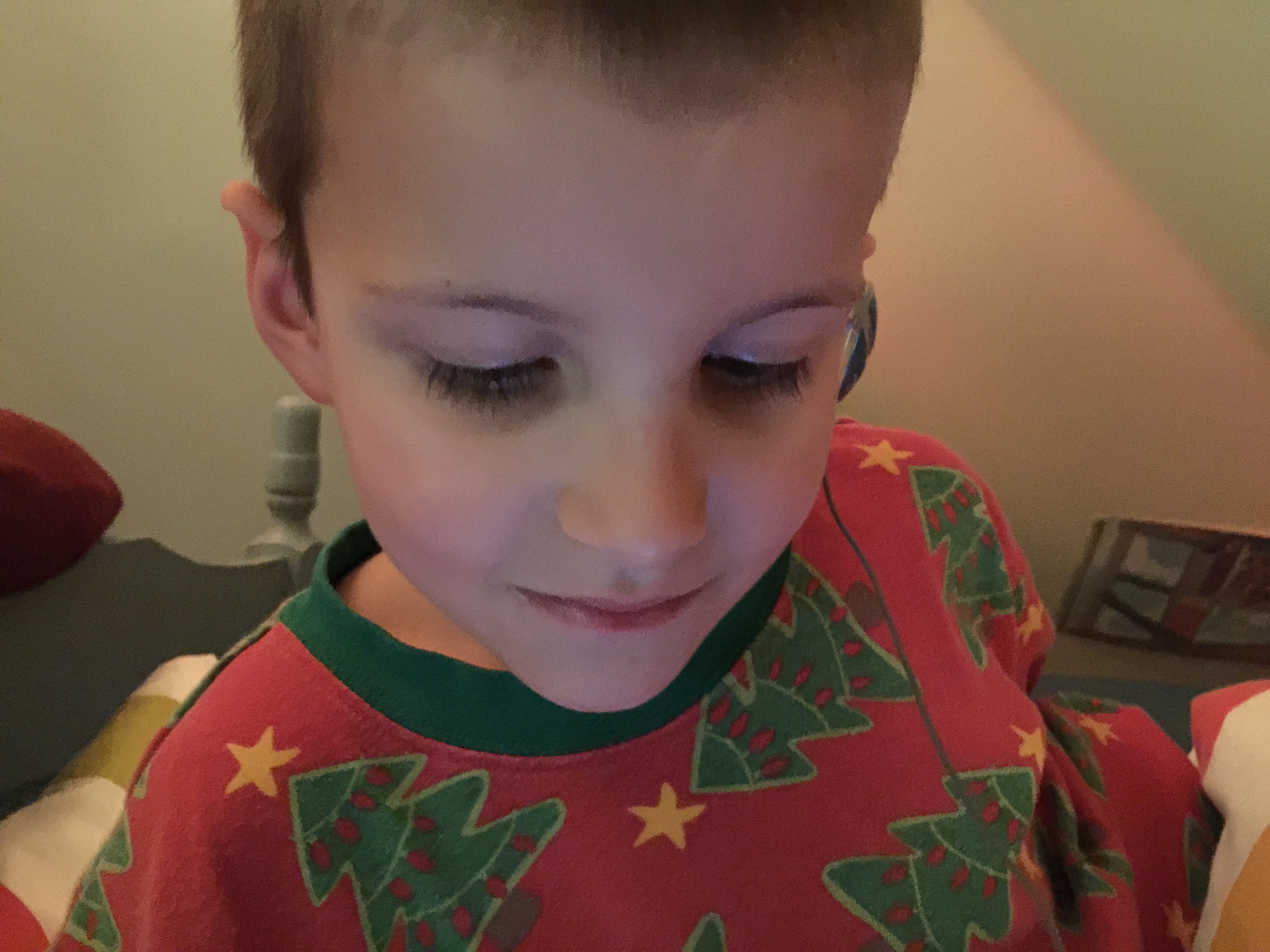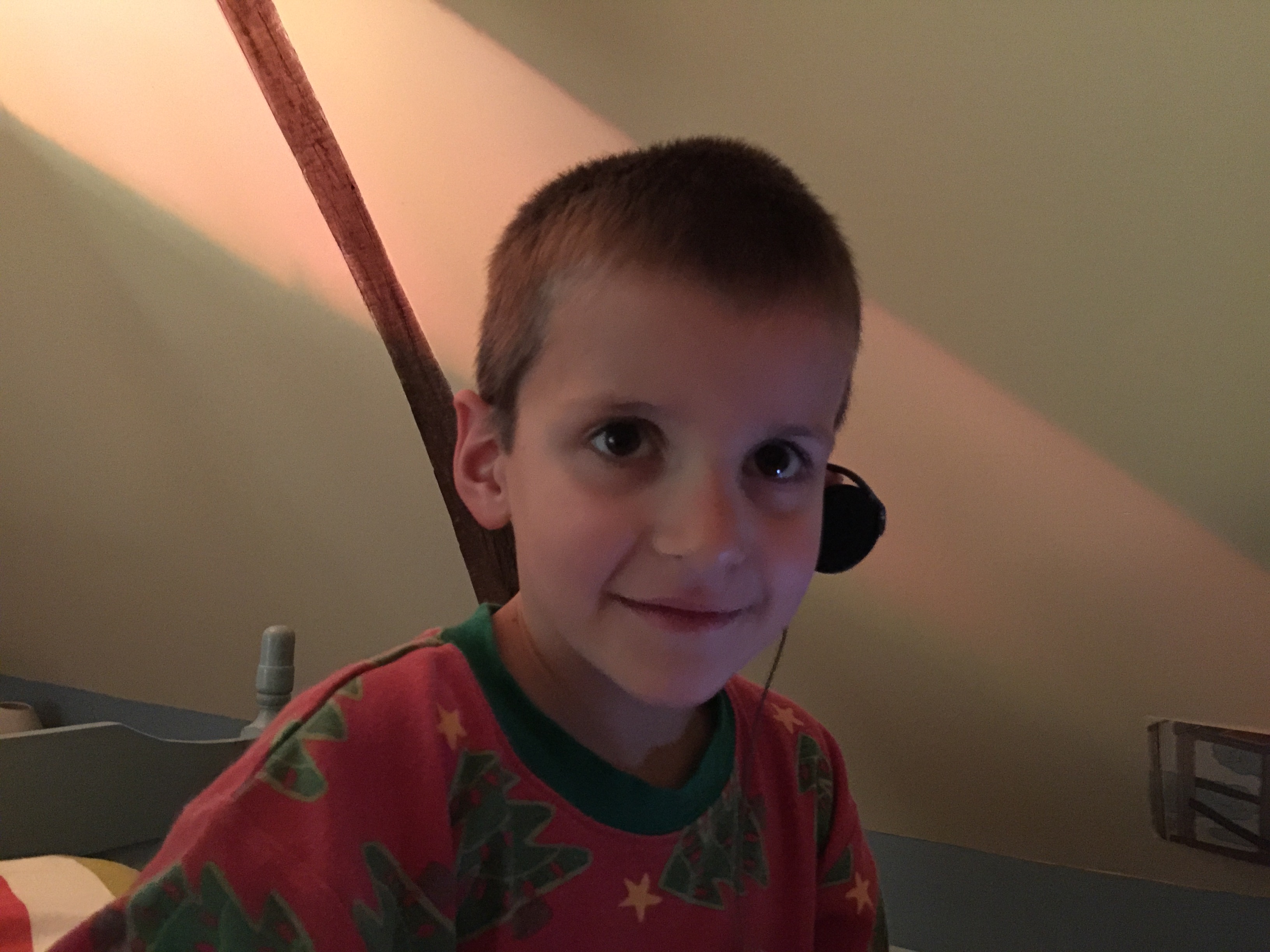 Here, he was delighted to have a music player of his own, with headphones, just like his older brother. We were laughing like crazy, as Gabriel seeks out — and plays — Aerosmith, which is a hard rock band. He was beside himself with happiness. And his eyes twinkled all the while.
