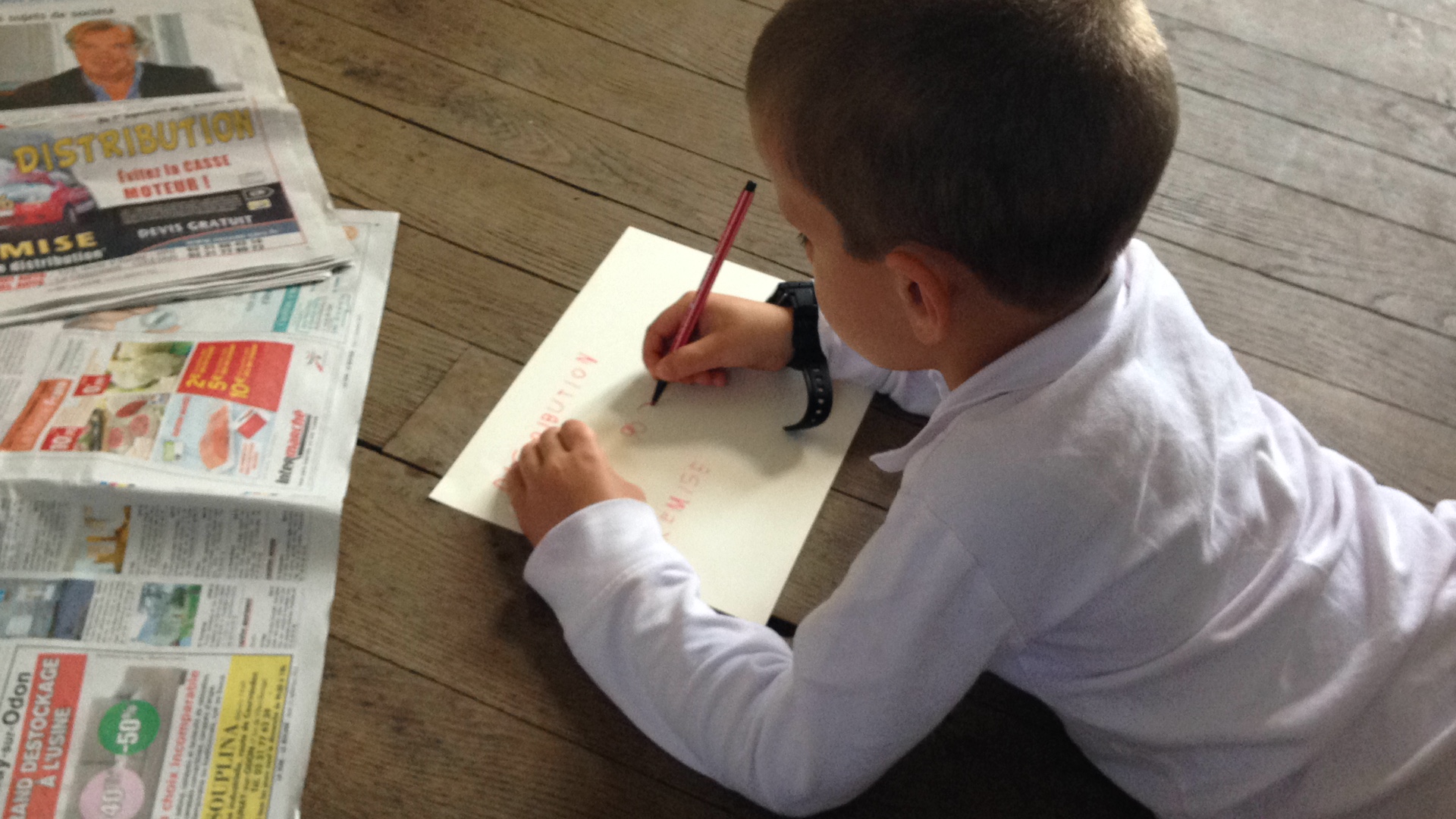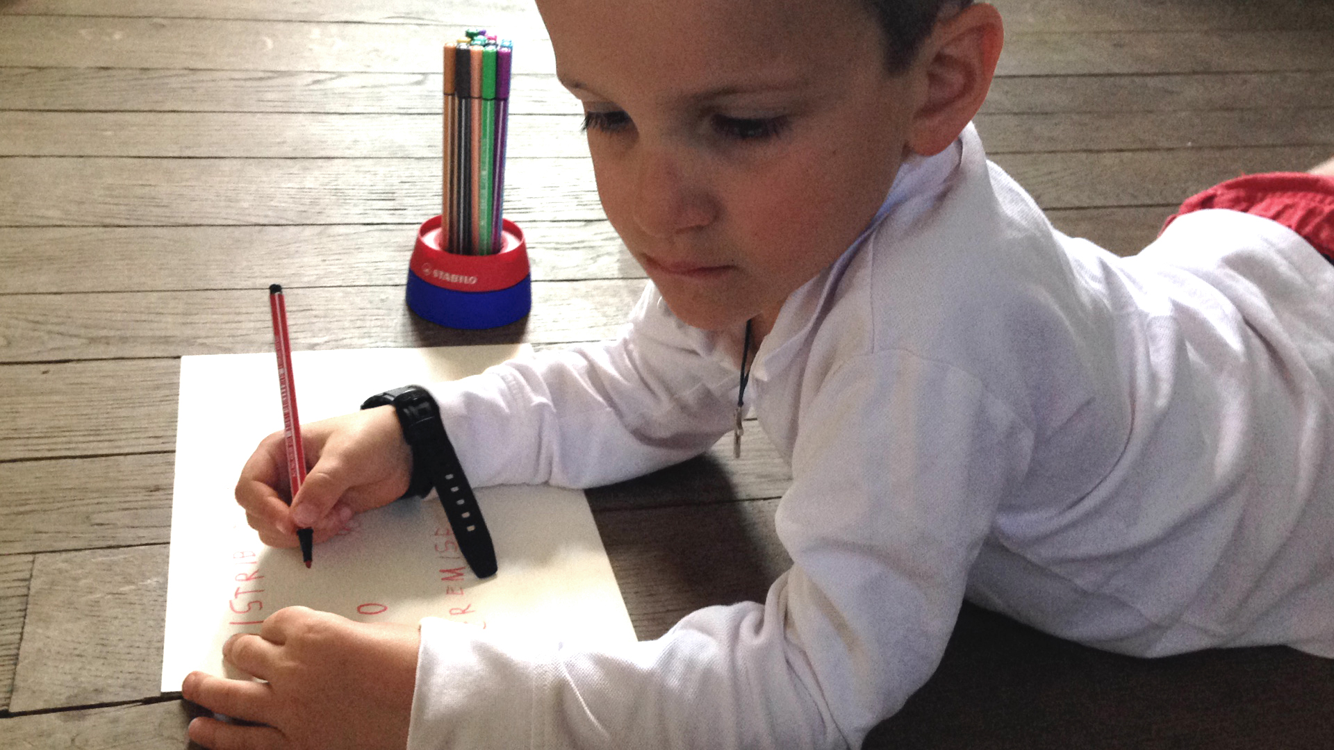 Today, I stepped out of the kitchen and into the hall, to find Gabriel lying by himself in the center of the hallway floor, completely relaxed, stretched out, spelling words on a piece of paper with a felt-tip pen. He was copying words from newspaper advertisements.