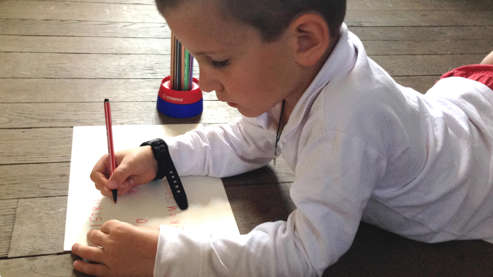 Now that he can write letters, and spell a few words, like his own name, Maxime's, Papa's and Mama's, we recently came to realize he is now intent on finding bigger challenges.