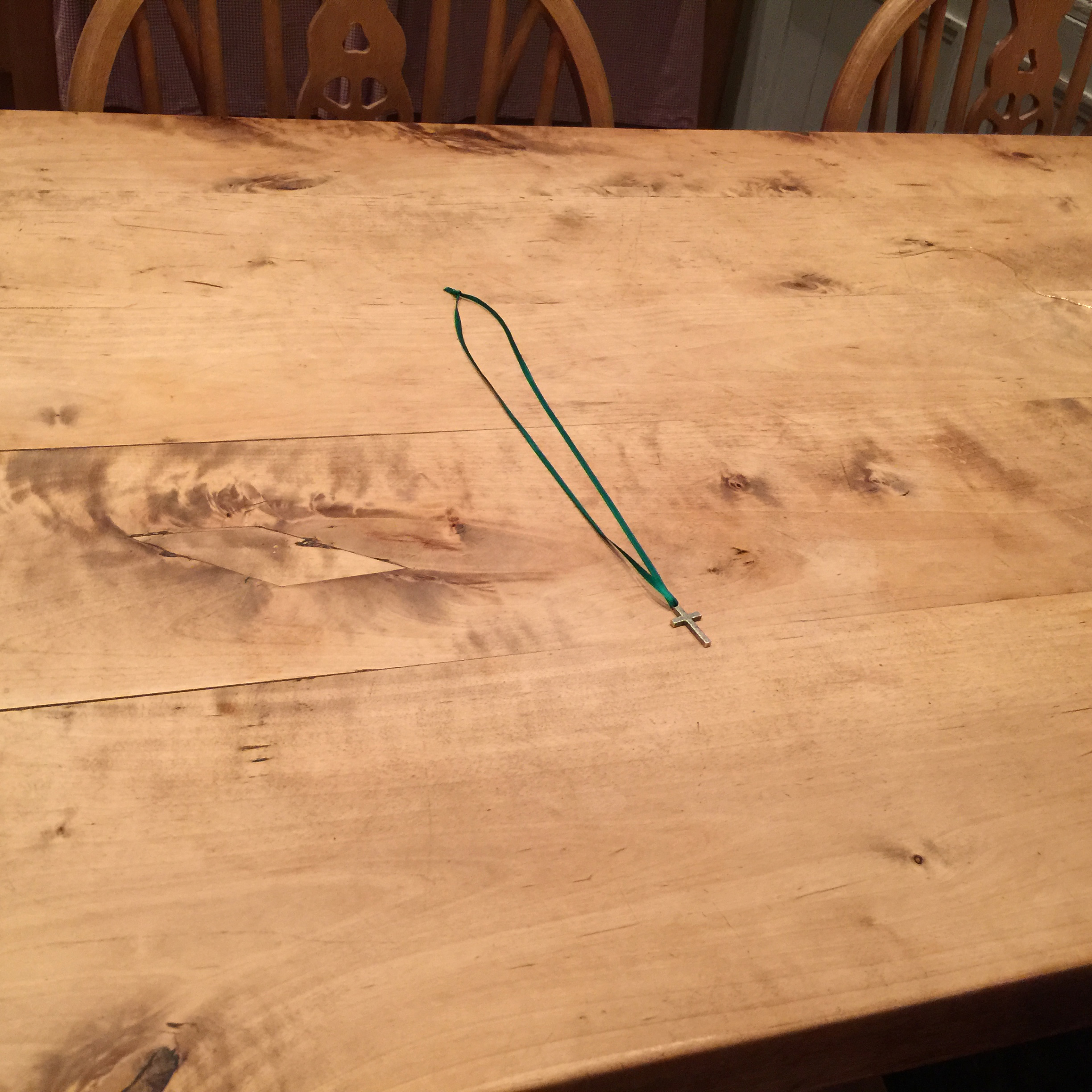 Well, Gabriel was happier than anything when he came down the other morning to find his cross lying on the kitchen table, with a new green ribbon on it. He put the cross around his neck right away, and was smiling from ear to ear.