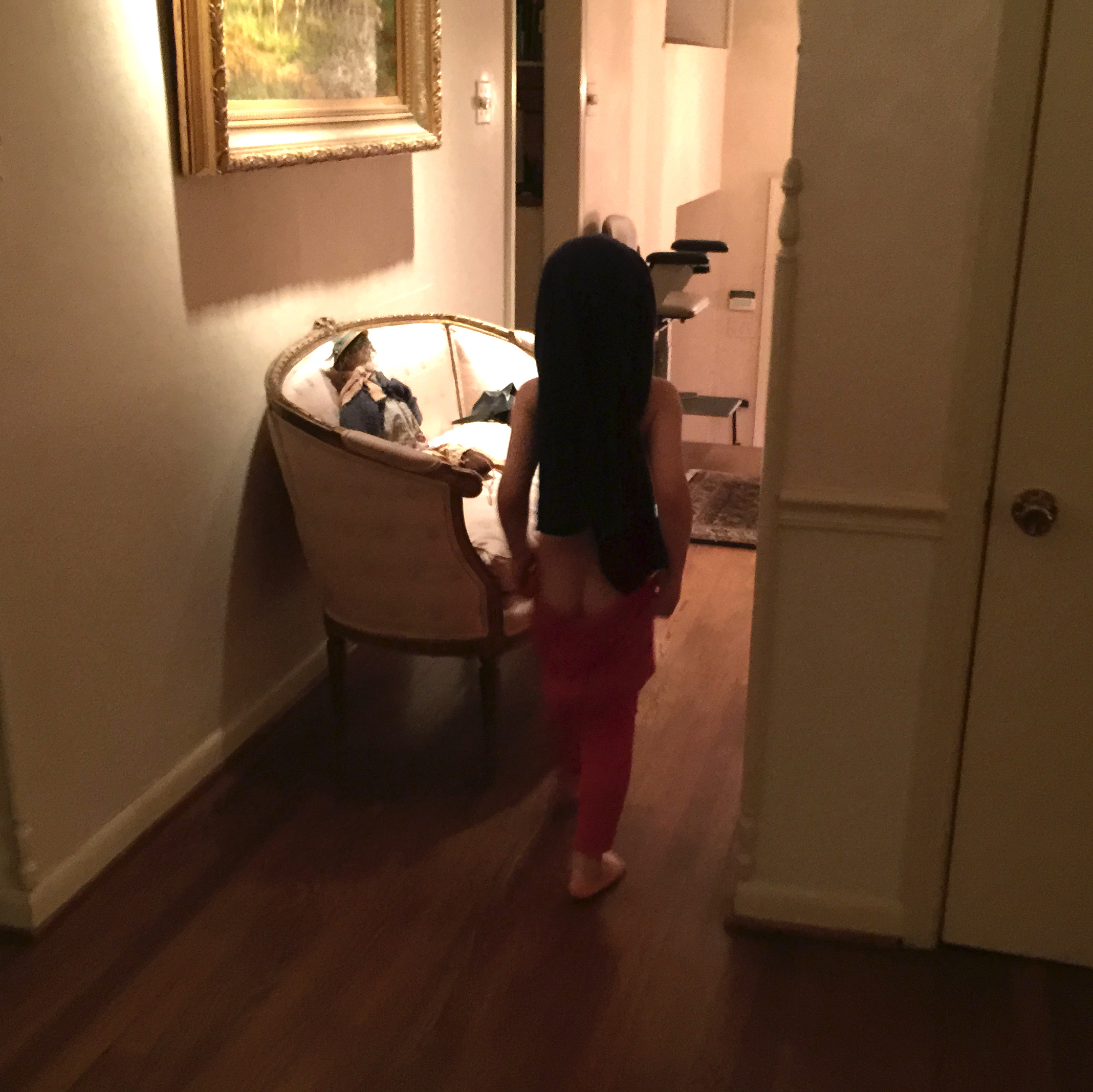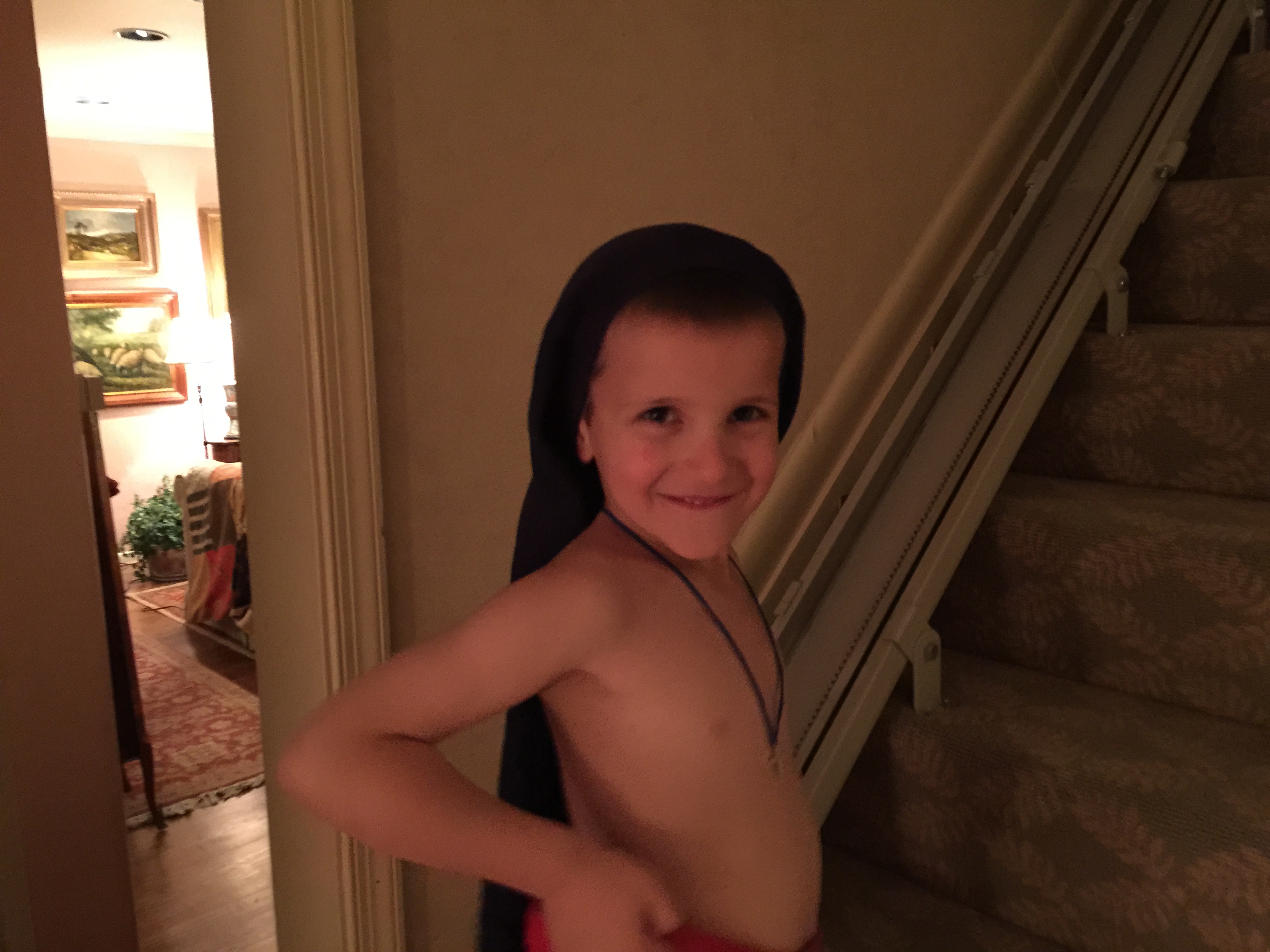 He comes downstairs, and seeks me out, to show me how good he is at it. But he has it backwards: his pants are on his head, and his shirt is on his legs.