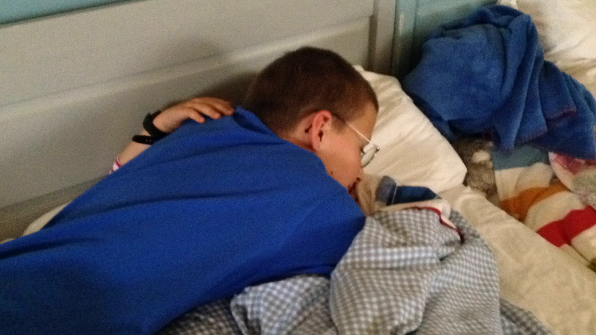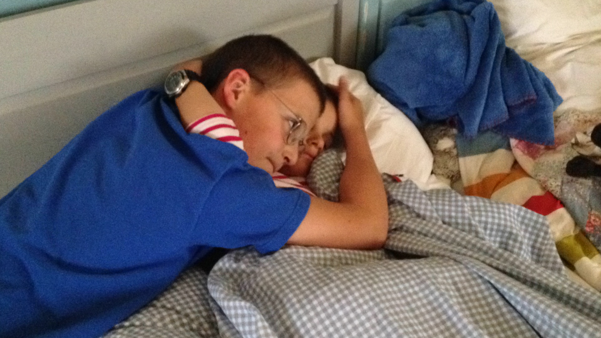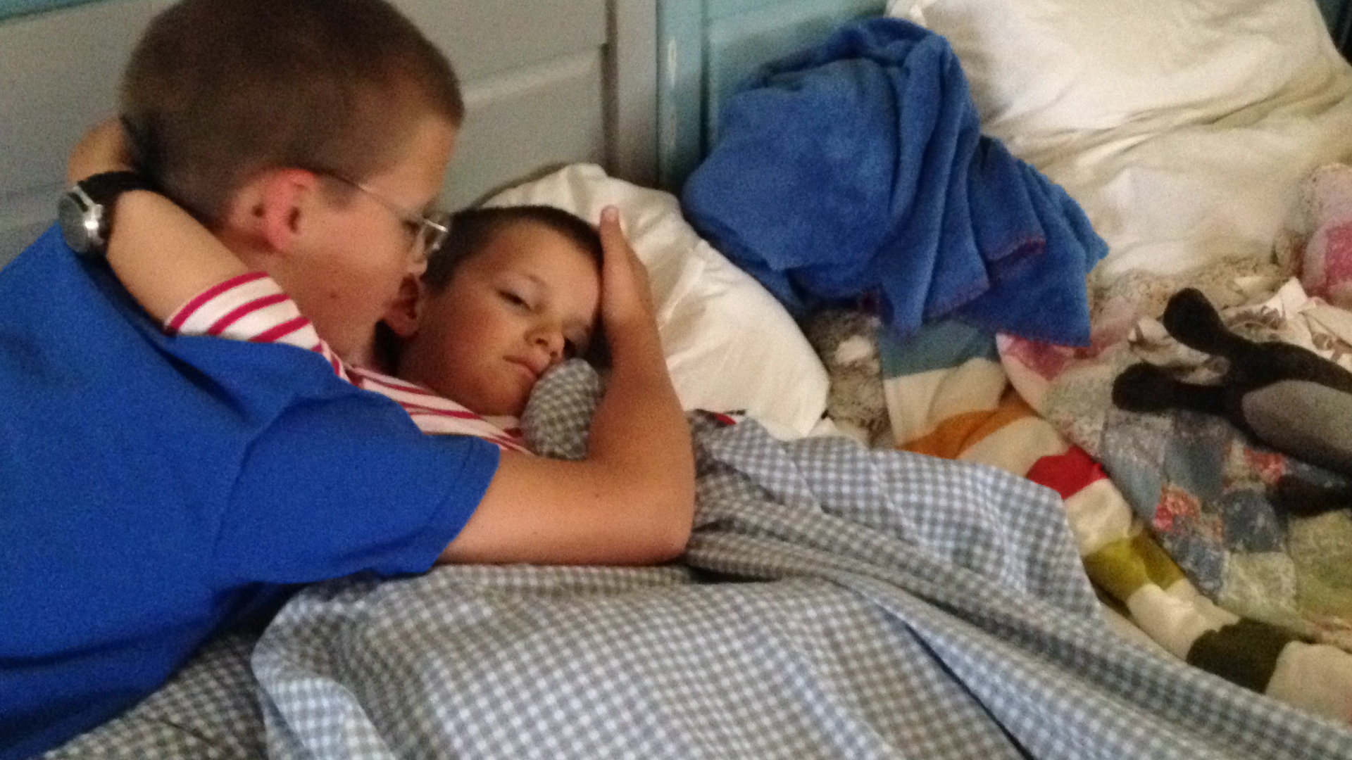 Gabriel takes a nap every afternoon, and Maxime wakes him up from time to time. Today I went up too, with Maxime, and as he was about to wake Gabriel, I thought to "take down" this way the brothers have of waking each other up.