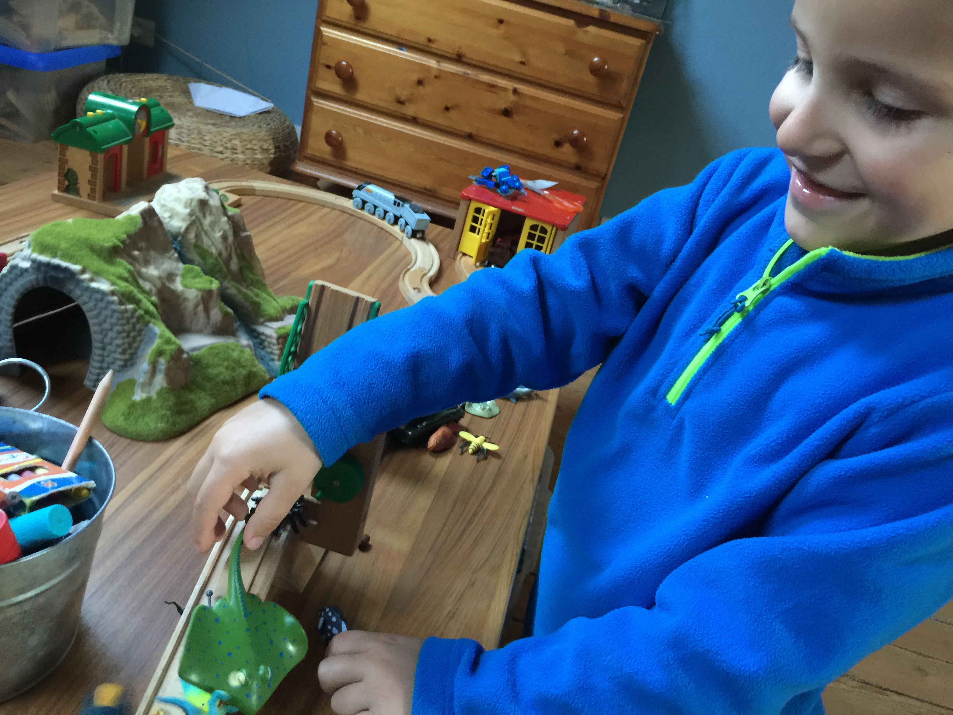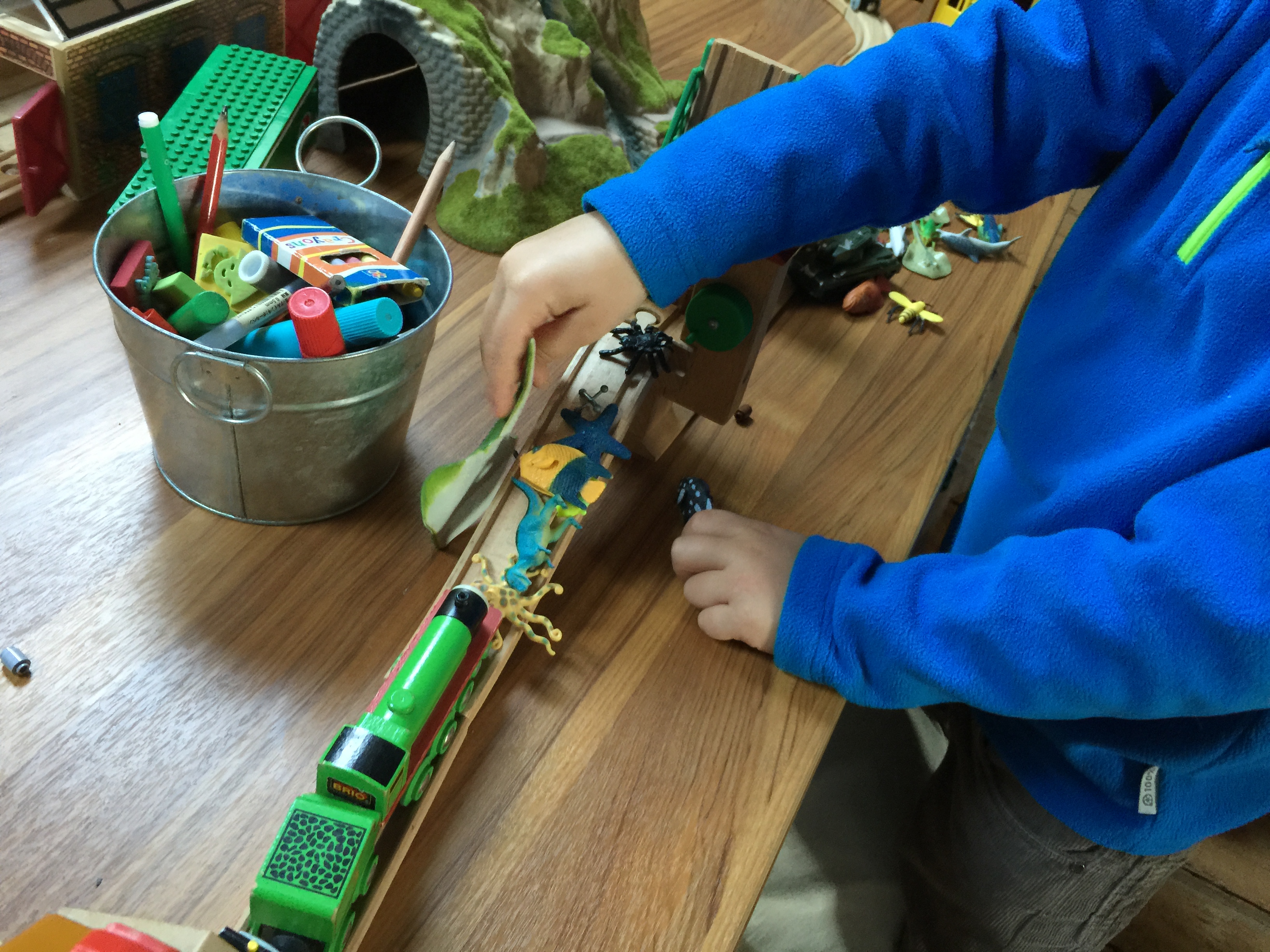 So, check it out. We are playing trains the other day. He has his train, and I have mine.