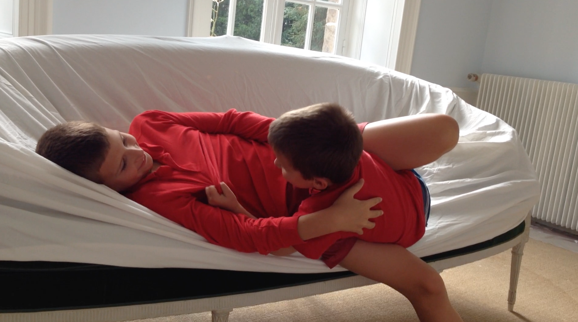 The other day they were horsing around on the sofa in the Salon, so I took up my phone camera, as is my wont these days. They were giggling and having fun, and I was so happy to realize toward the end that I had caught this protective disposition of Maxime's on the video.