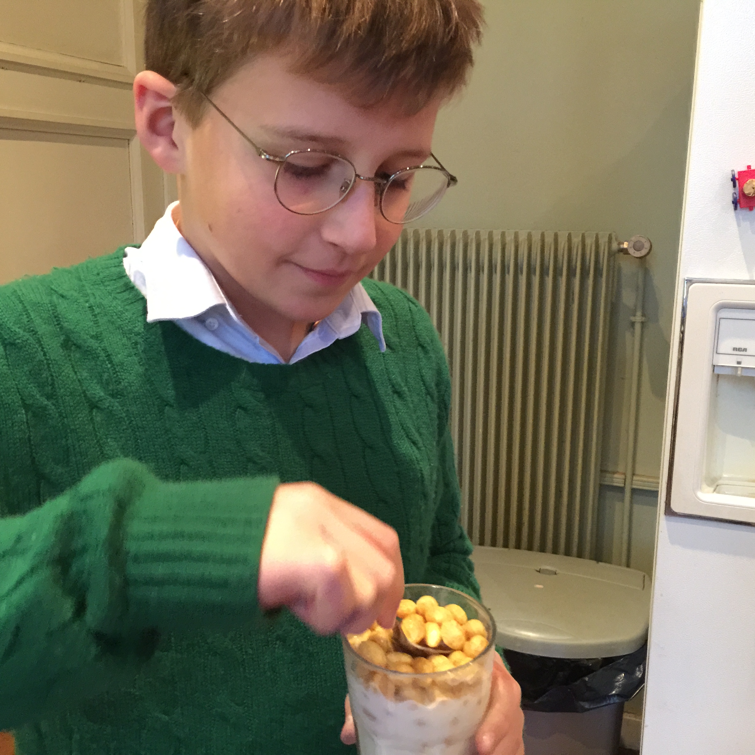 Now the other day, as I meander into the kitchen, what do I find? Maxime eating cereal with milk, but out of a glass. Now while I will admit this makes more sense than the previous rendition sans lait, I am waiting for the day when I see him eat cereal out of a bowl, in proper-like, American fashion. He is half American, after all. Or one quarter, I guess.