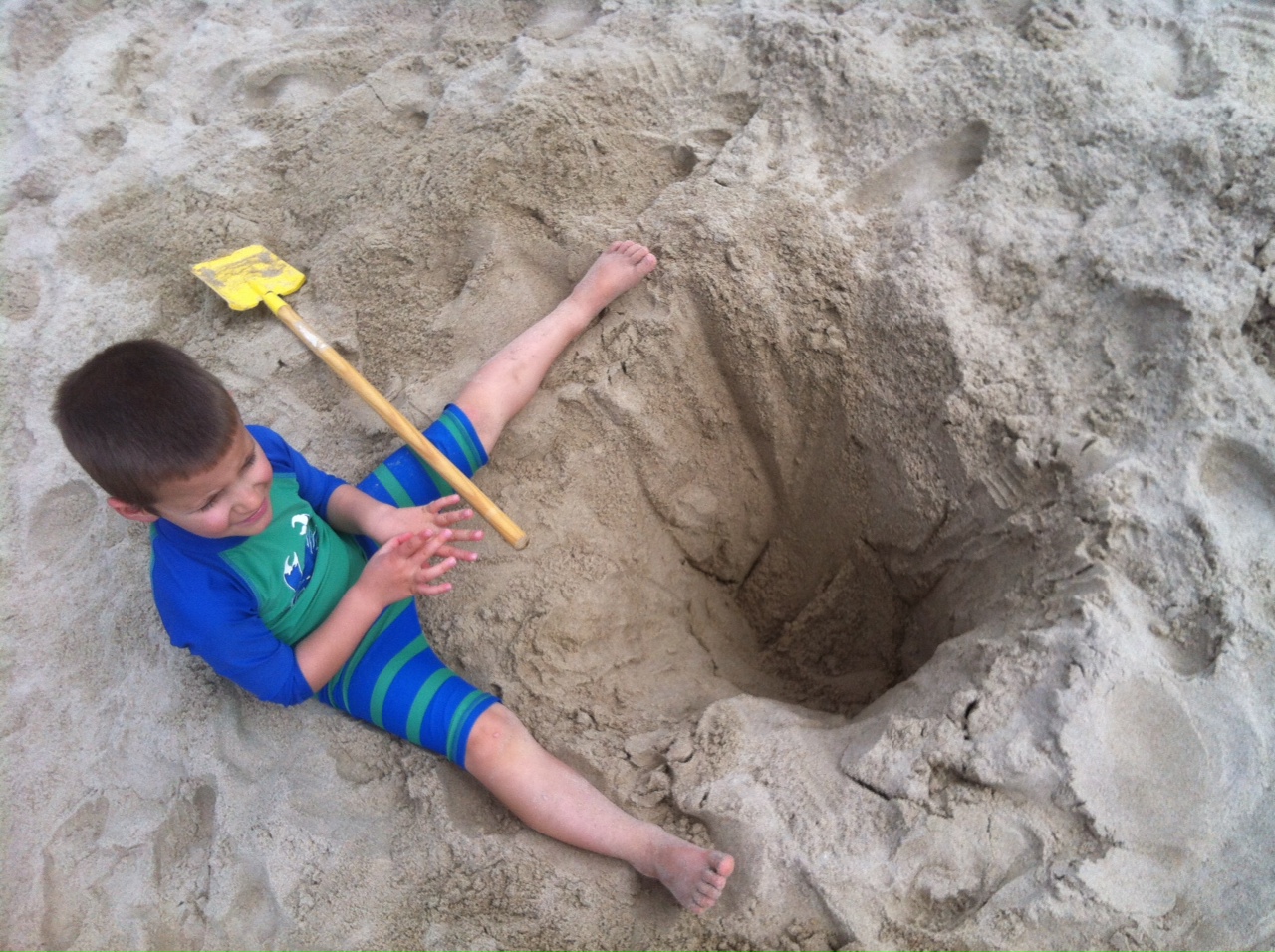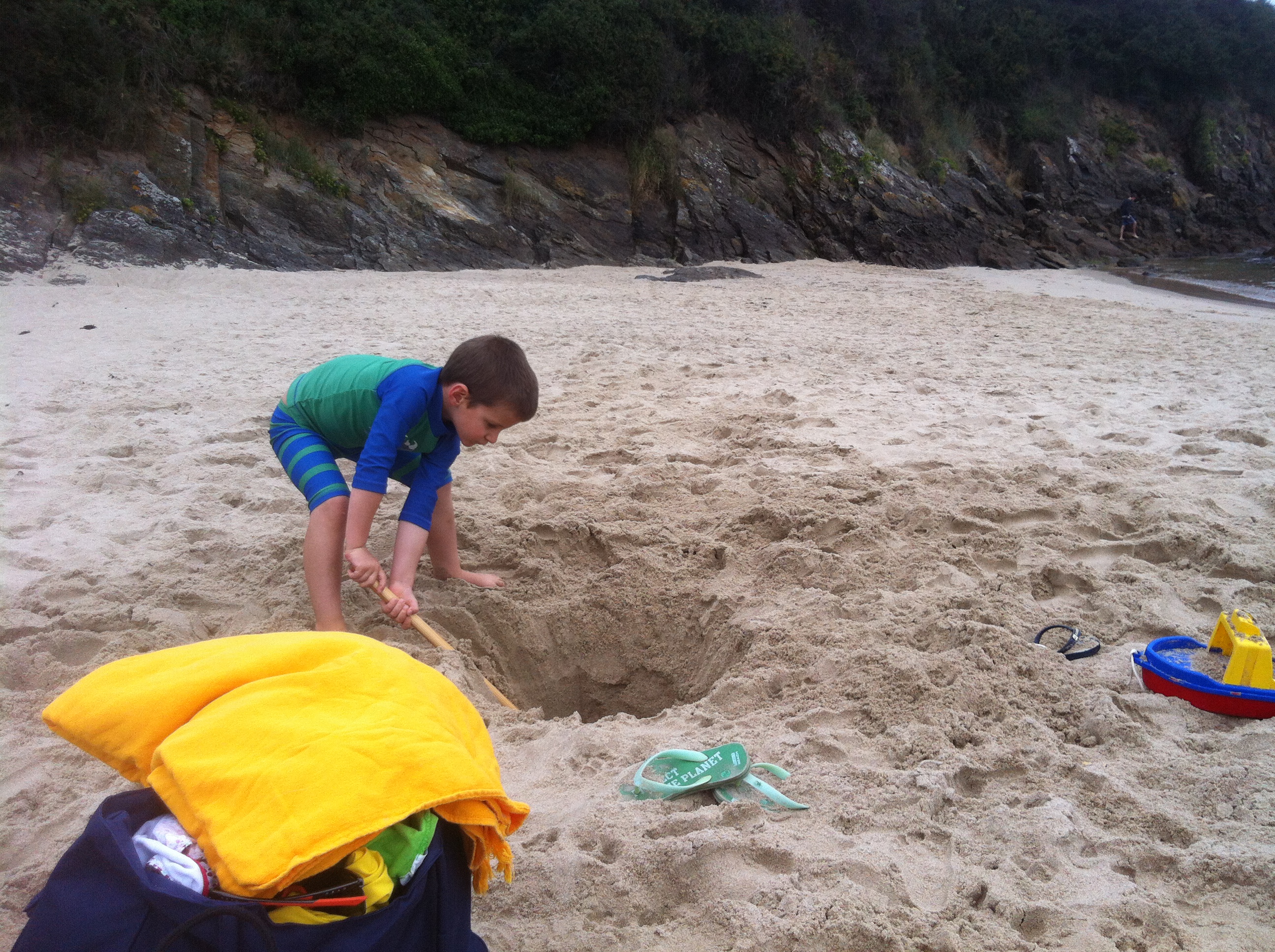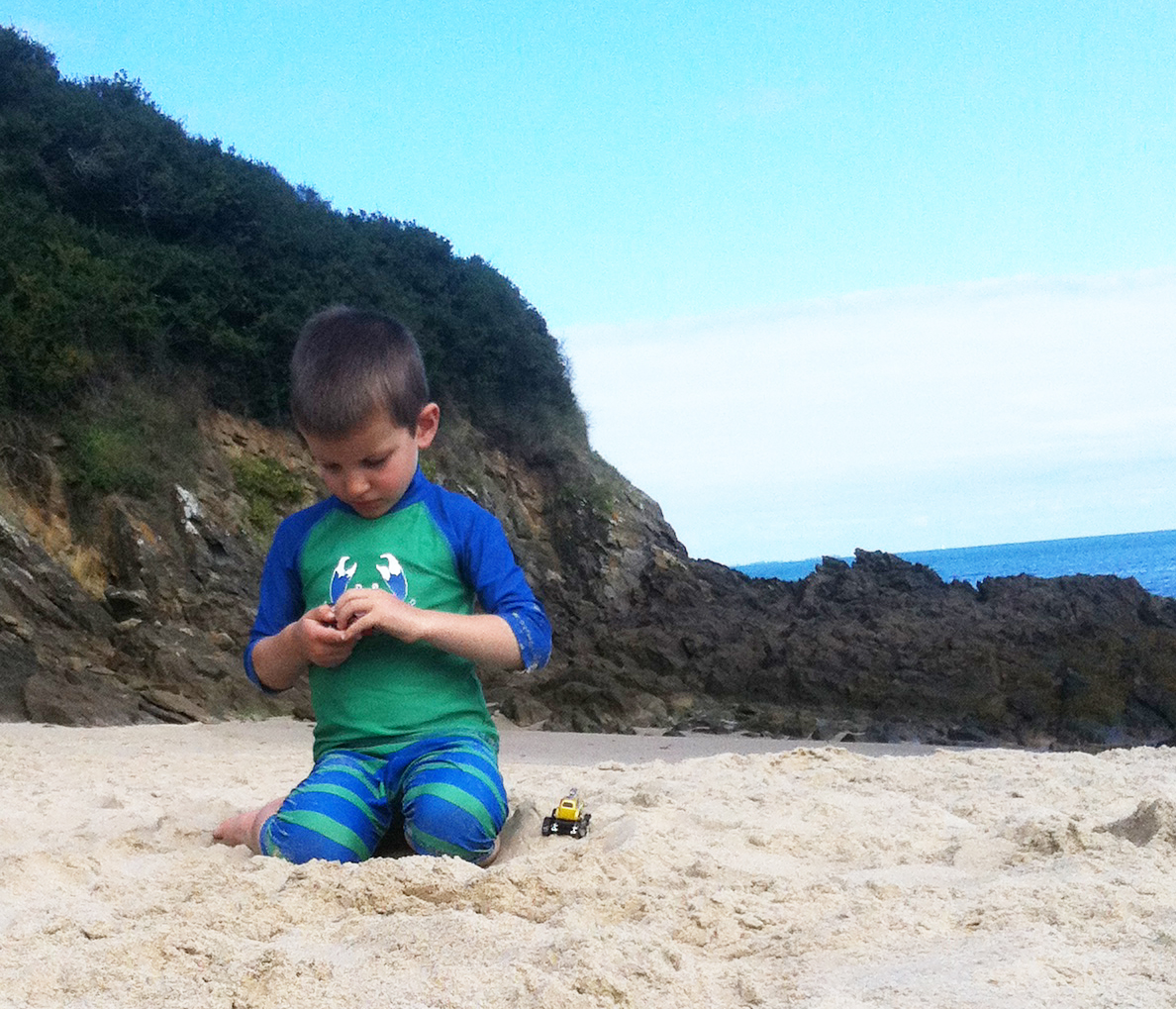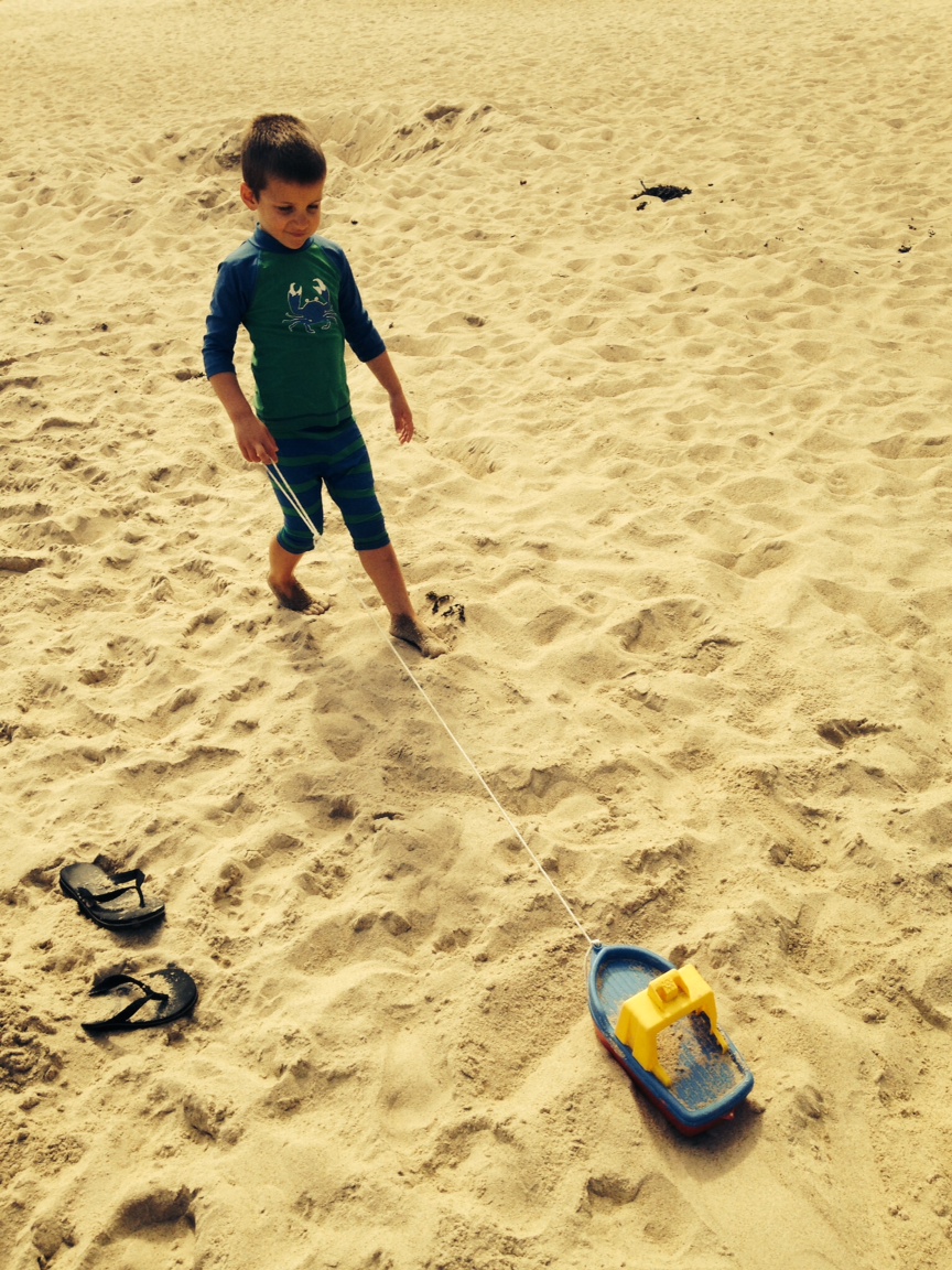 Gabriel loves digging, and sandcastles. And dragging his boat-on-a-string over the sand. Sometimes he drags it at a full clip, as fast as he can go, over the bumpy sand hills, which wreaks havoc behind, and the boat has issues with this.