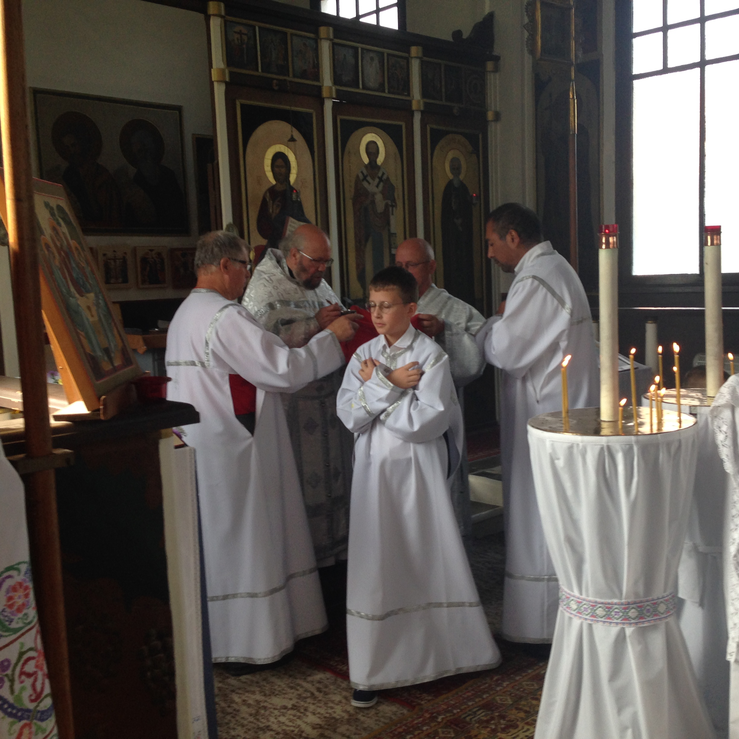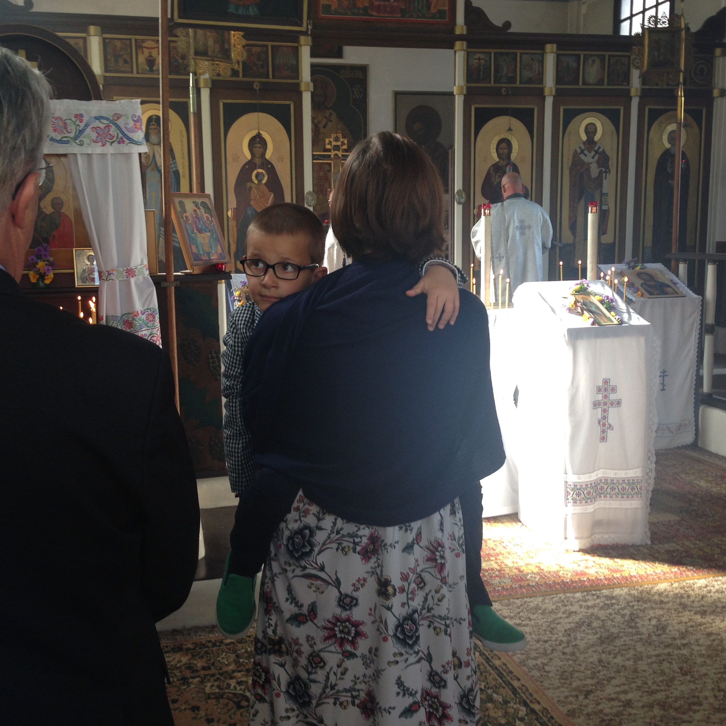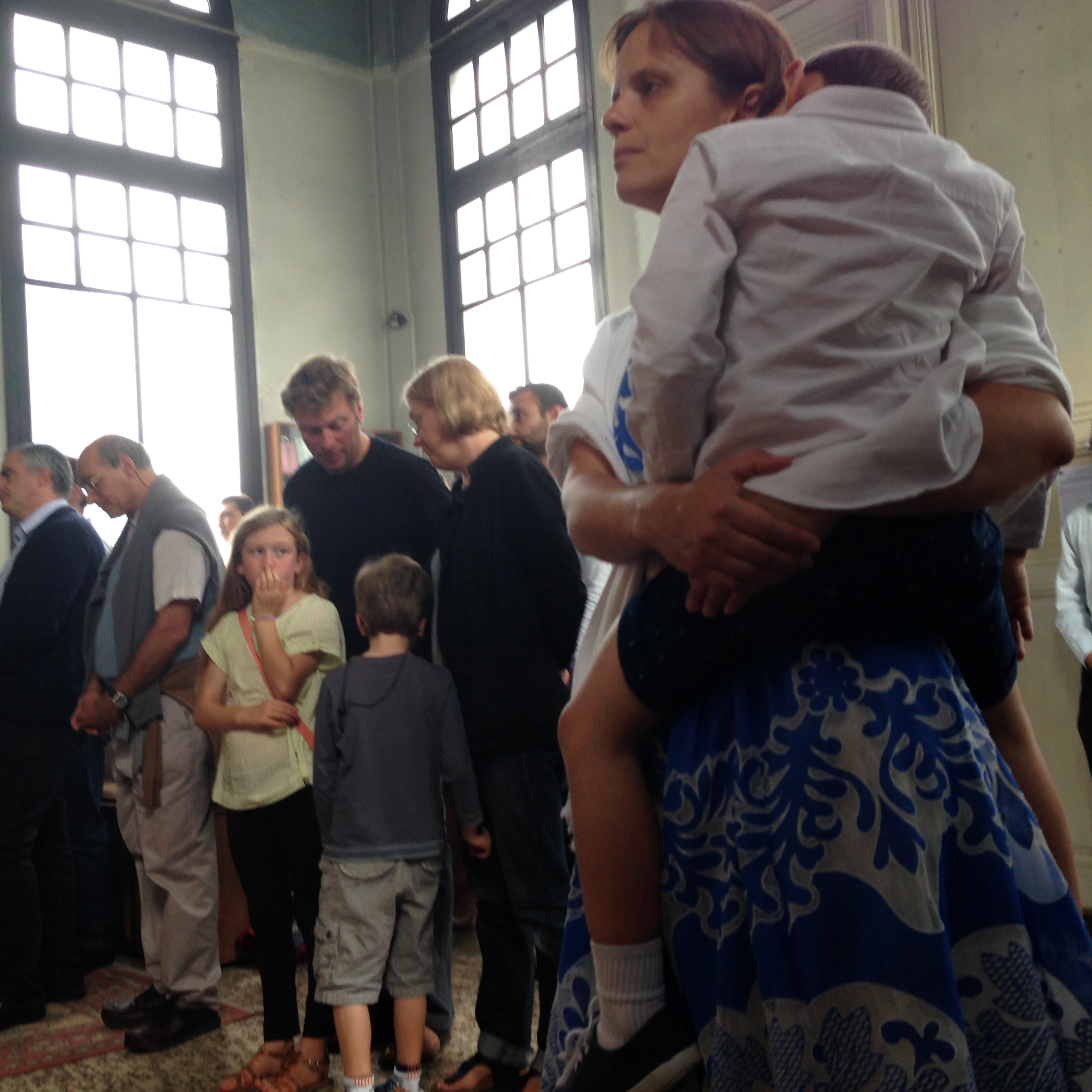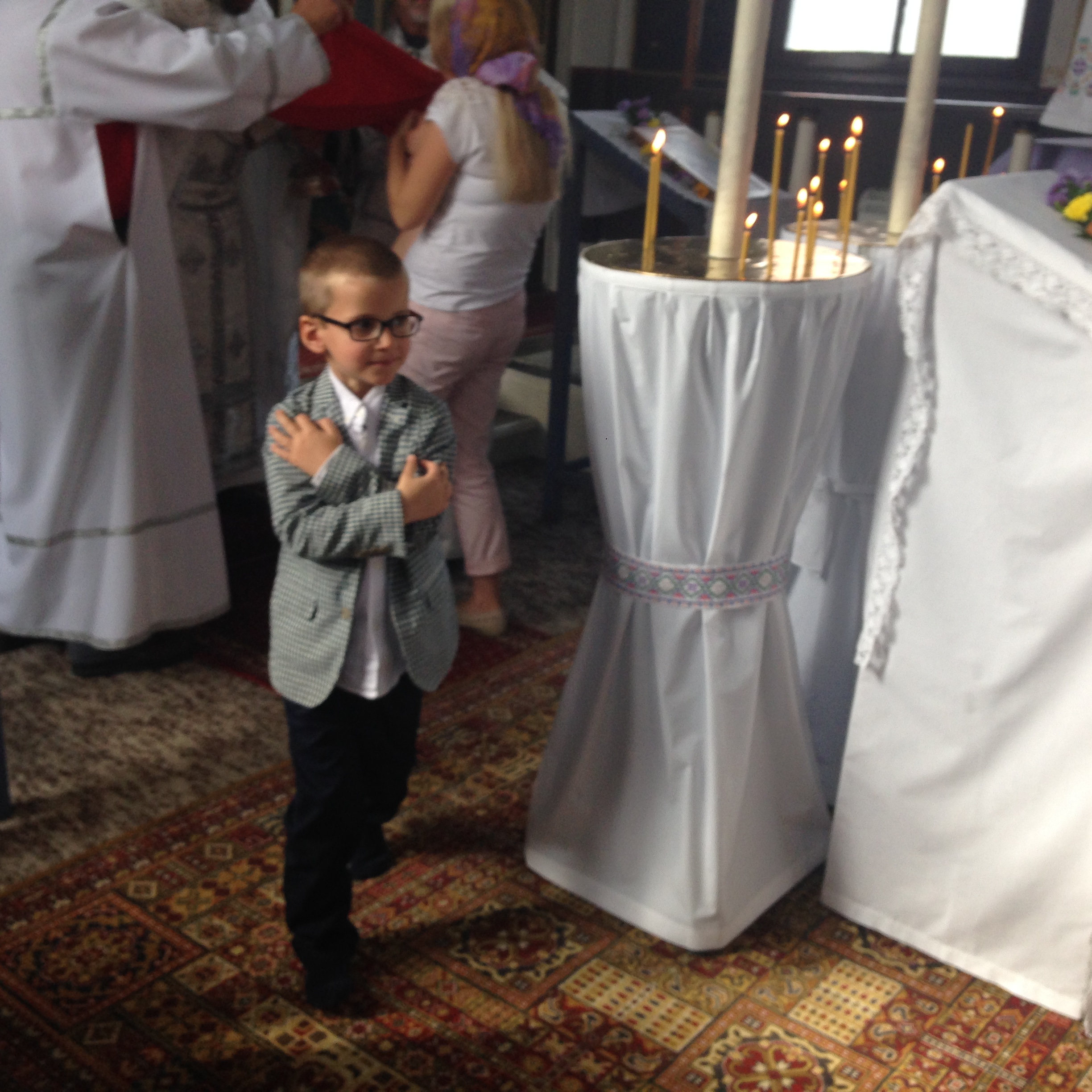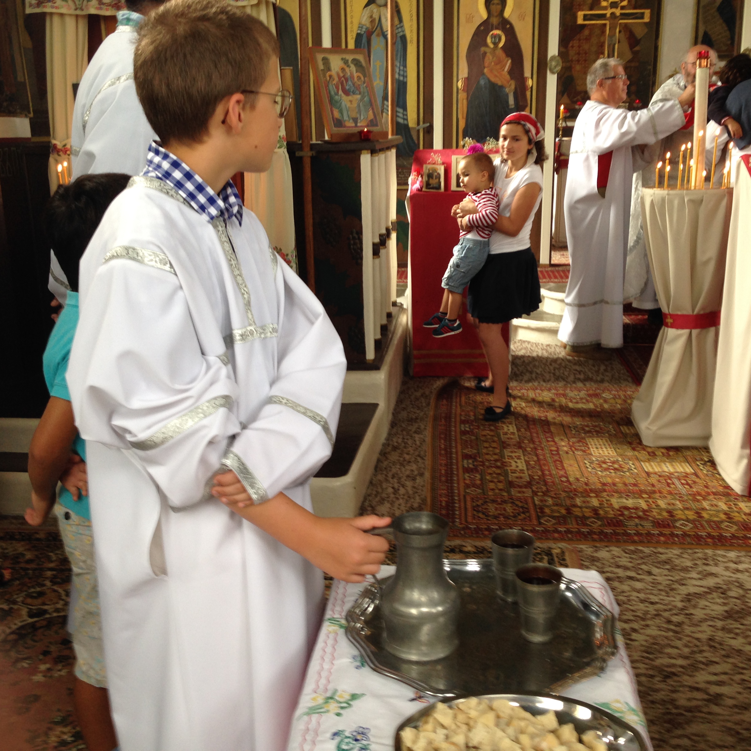 Maxime always serves at the little church, and he serves sometimes here, too. When Maxime serves, Gabriel is very proud to be able to stand next to him when it is time to keep the wine chalices filled for those who have just taken communion. While this is Maxime's responsibility, of course, Gabriel nonetheless seems to feel some sort of vicarious grownup-ness by simply standing close to his brother.