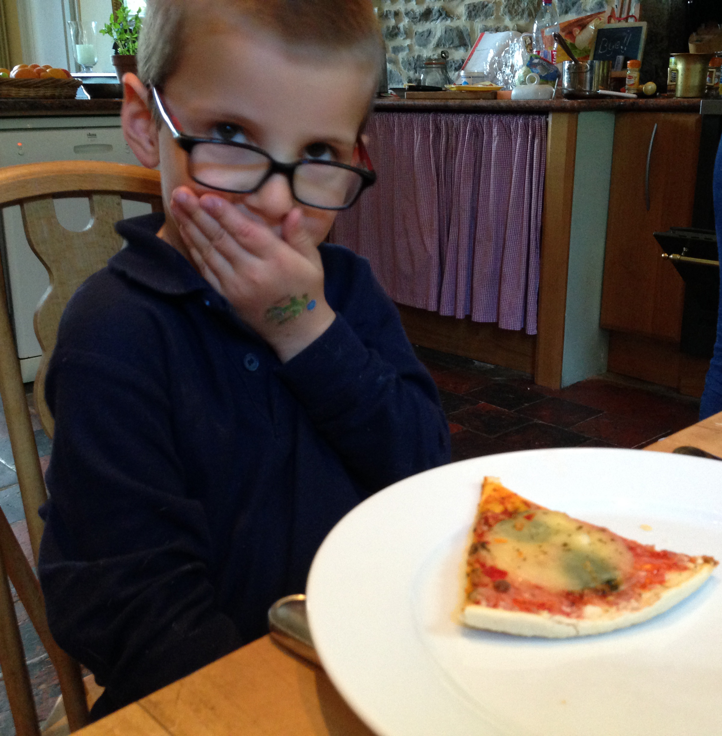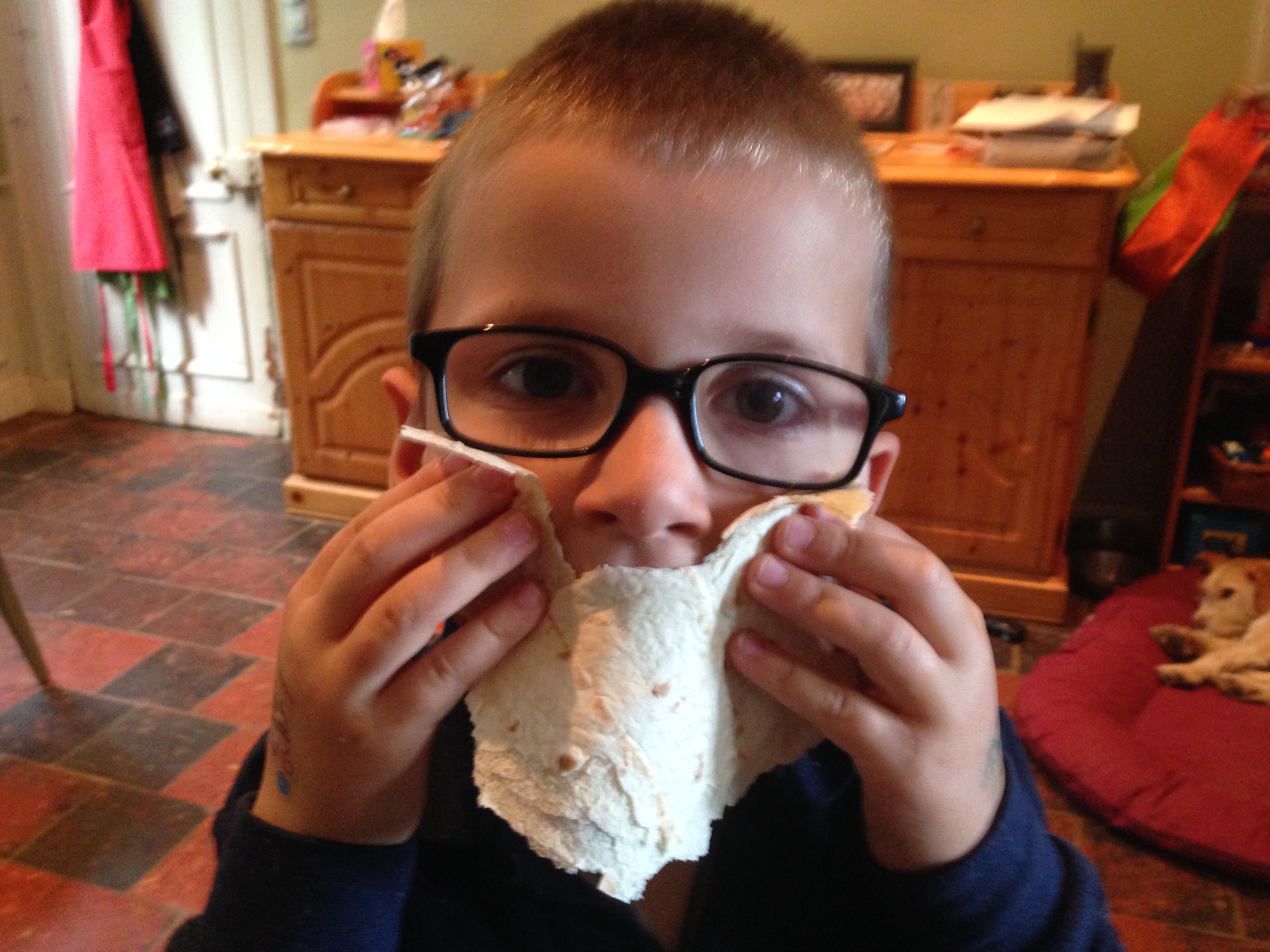 But this time, Gabriel, being Gabriel, decided that he would prefer to have a couple of pieces of left-over pizza as a starter (offered by Mama), before he had a Mexican wrap.