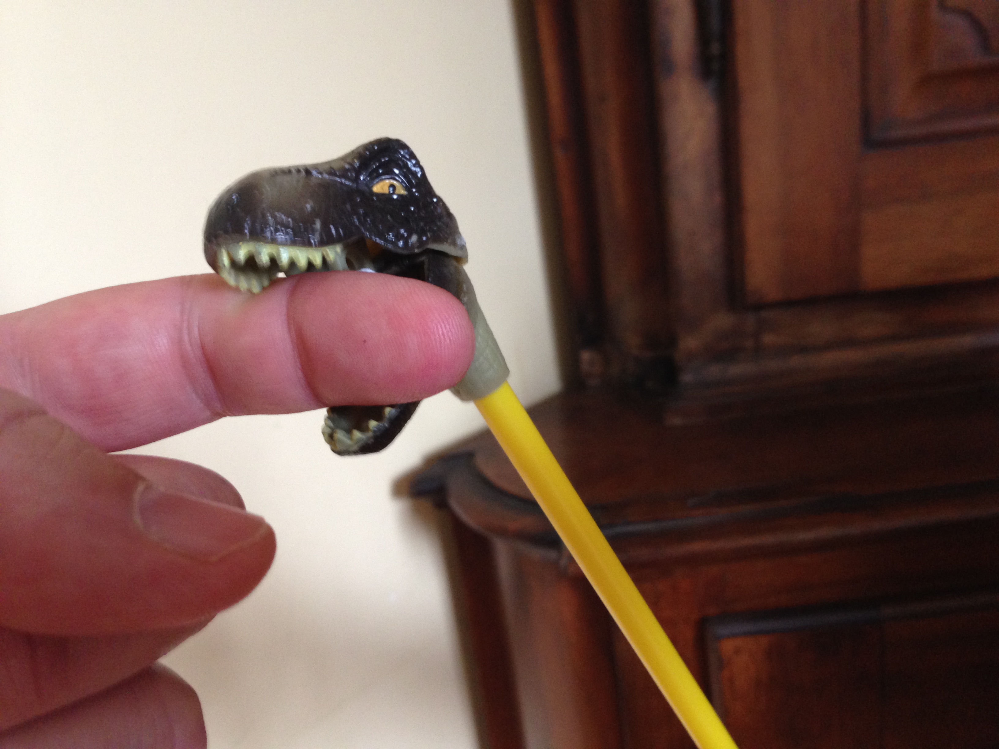But today, Gabriel picked up this little dinosaur clamper thingamajig, (that I remember having as a kid, too, but I always played nice with it, I swear, and I never thought of going after anybody with it, least of all my younger sister), and he comes up to me and says, in perfect English, in a phrase he never uttered before in his life: