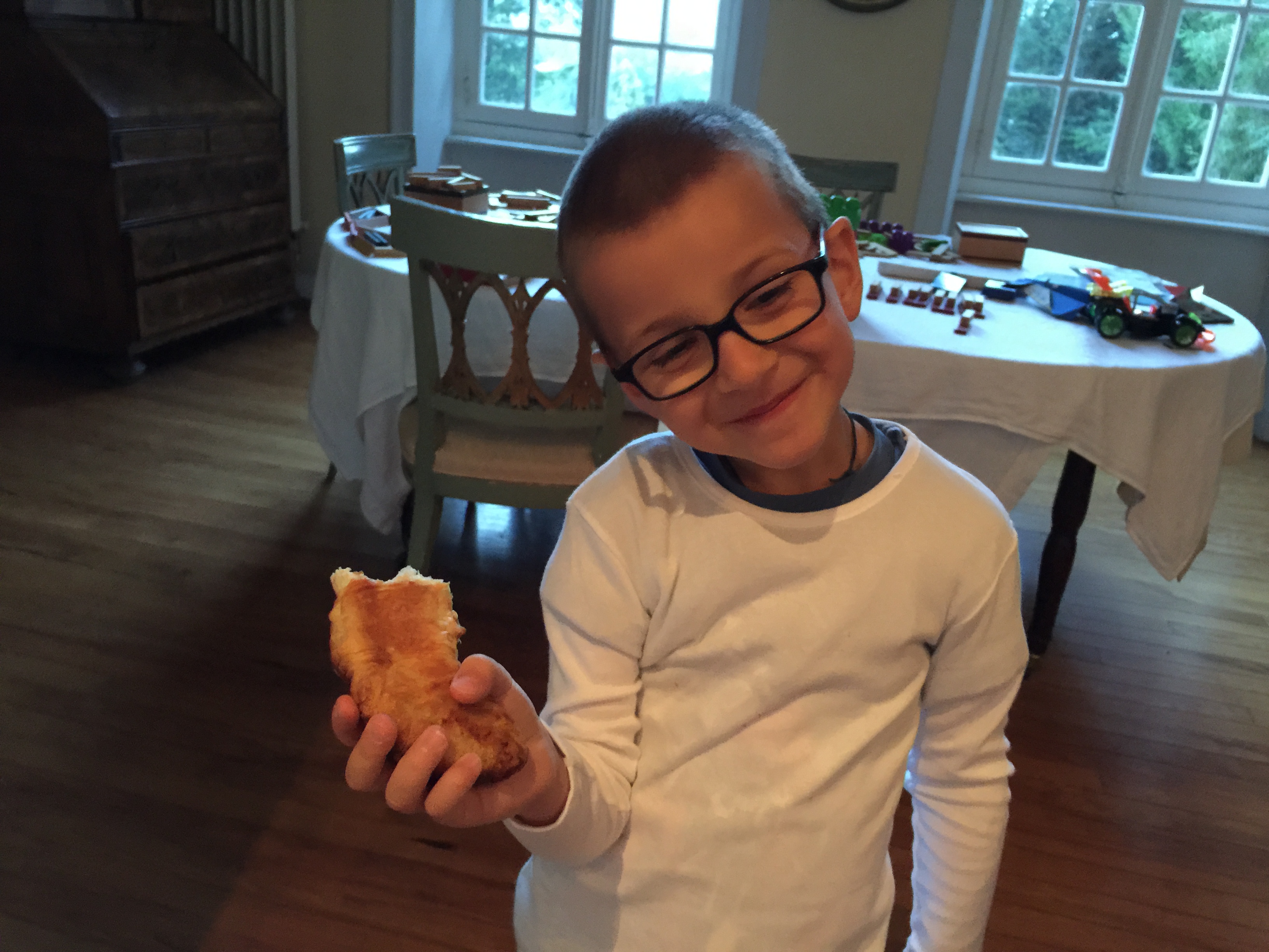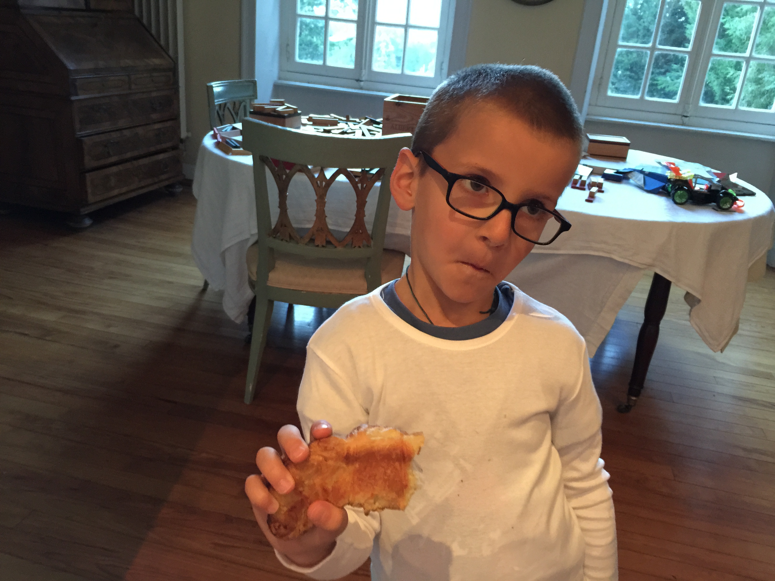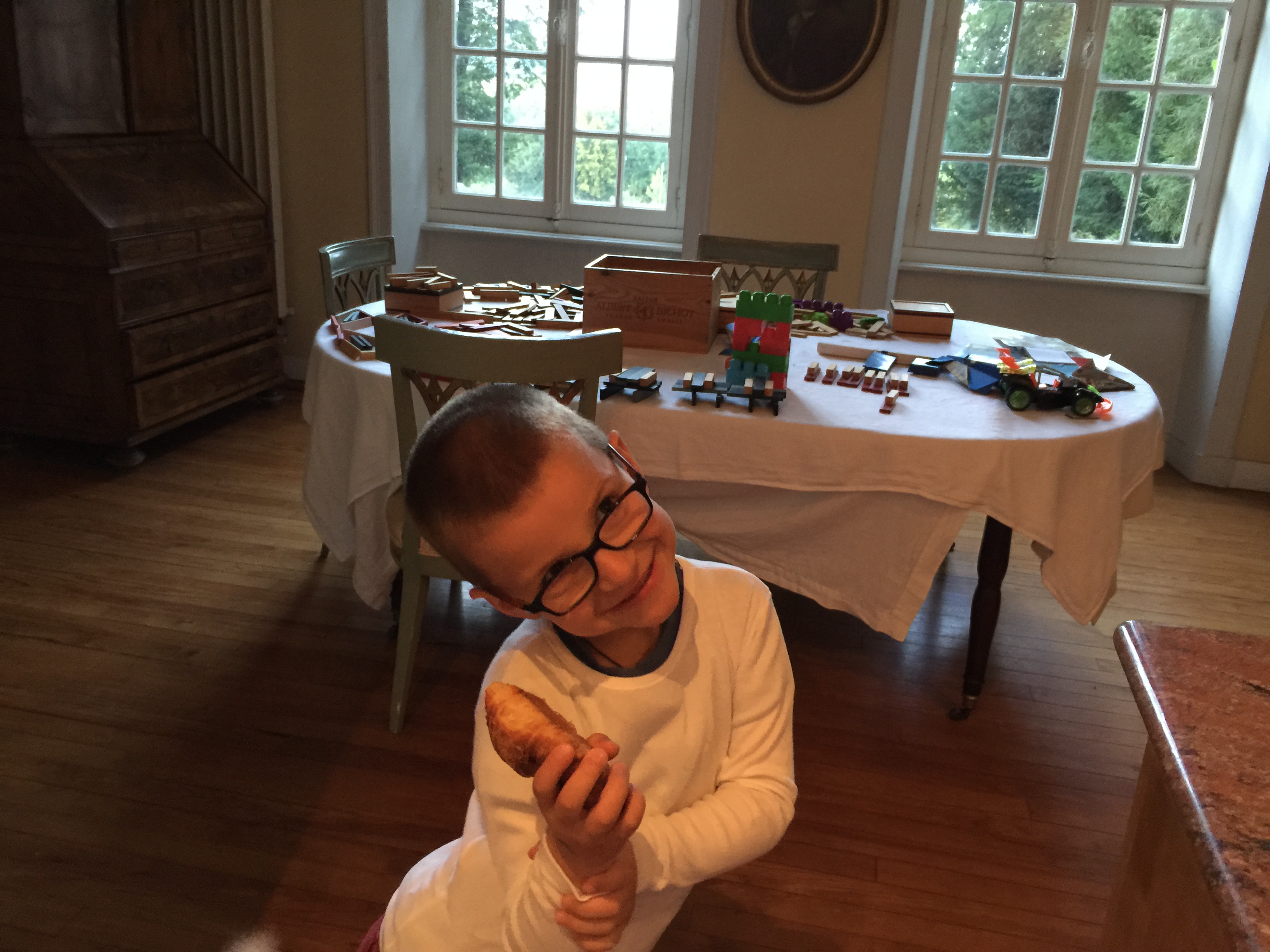 When a bag arrives with a croissant or two in it, he is most definitely not going to just sit around and nod politely, pretending the event is anything less than a mainspring for ebullient celebration.