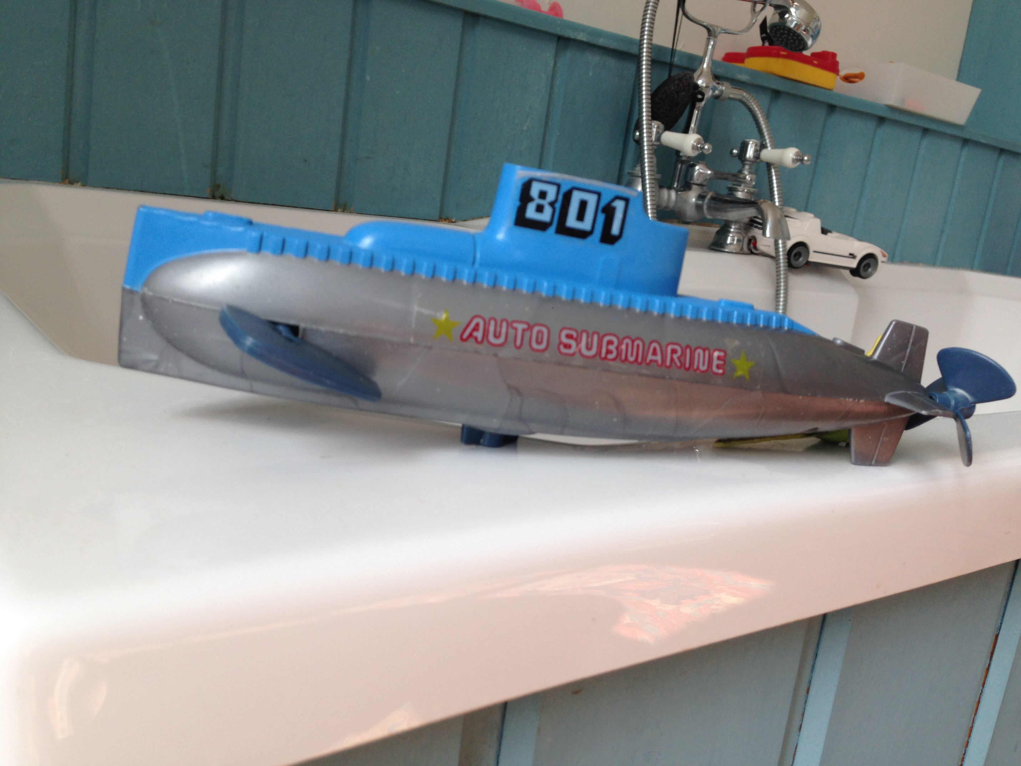 We play with cars, boats, and even a submarine, which has battery-powered propellers that entitle the submarine to move around underneath the bubble-covered surface, so we never know where it will end up, and lots of times we have to really hunt for it.